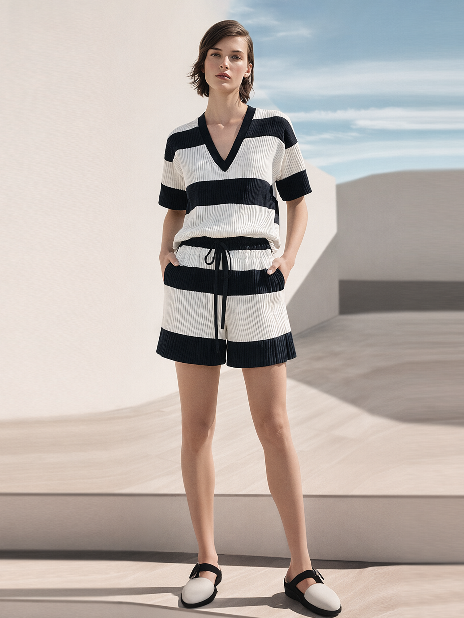 A chic, easy-to-wear two-piece set featuring a V-neck striped knit top and matching shorts in classic black and white. The lightweight knit offers a soft handfeel and gentle stretch, making this set perfect for warm-weather days, travel, or relaxed weekend wear. Its timeless stripe pattern and modern silhouette create an effortless, put-together look with minimal effort.