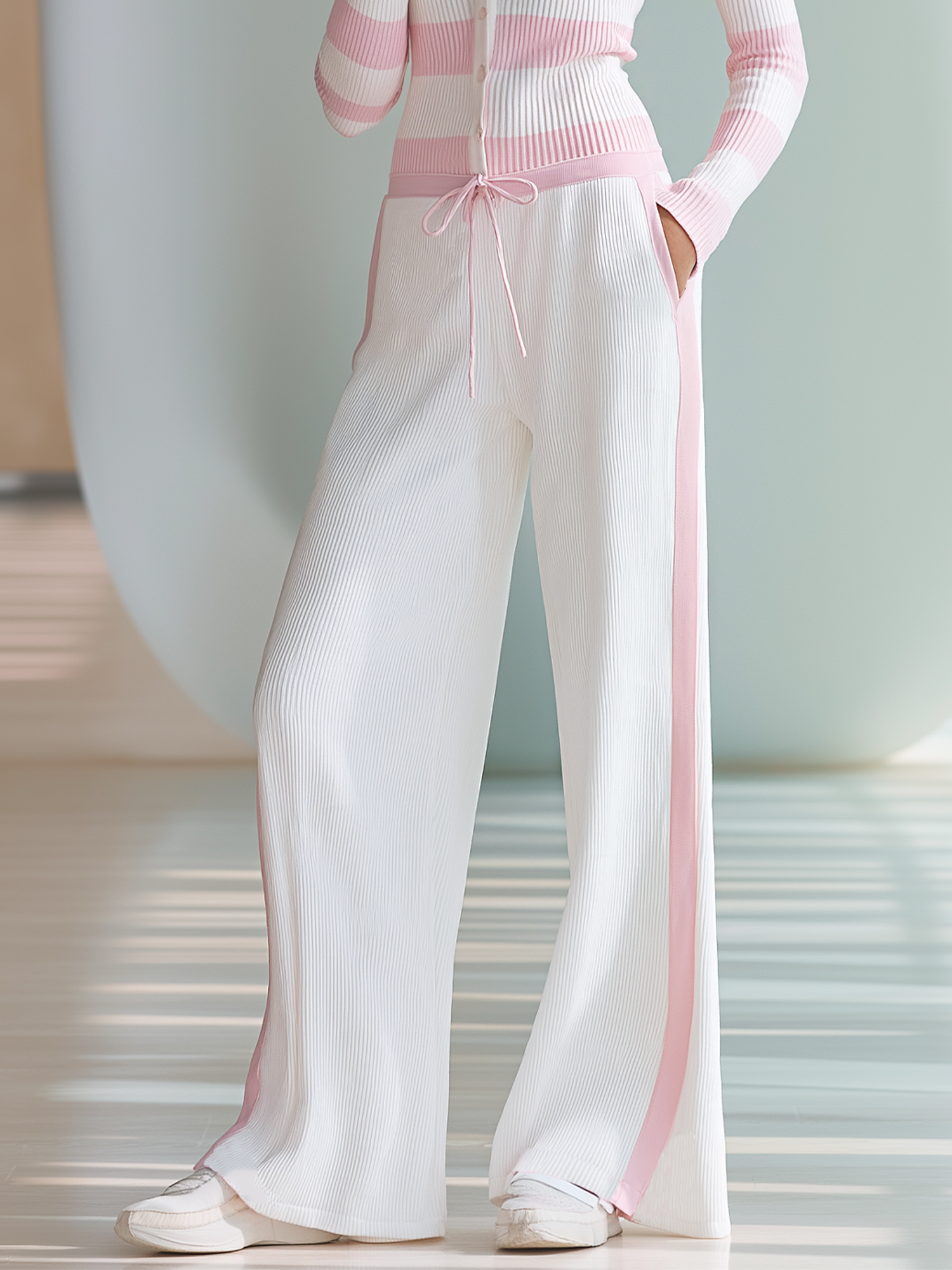 This Pink And White Striped Knit Cardigan And Wide-leg Pants Set is the perfect addition to any fashion-forward wardrobe, offering unmatched comfort while maintaining a stylish edge. Ideal for those who appreciate versatility and effortless style.