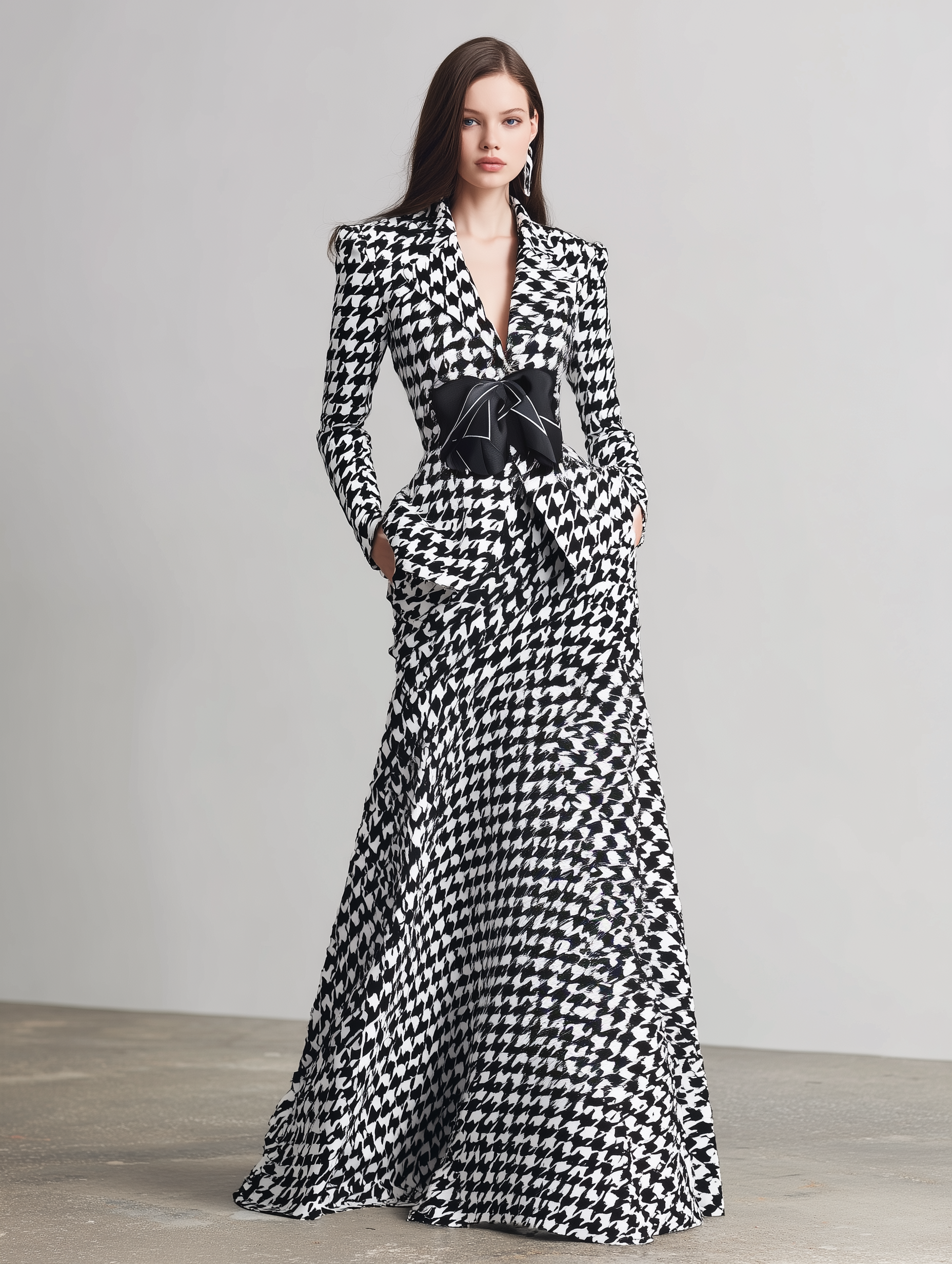 Introducing a sophisticated and timeless piece: Women’s Black And White Houndstooth Bow-Decorated Long A-Line Suit. This elegant suit masterfully combines classic design with contemporary details, making it an indispensable addition to any wardrobe.