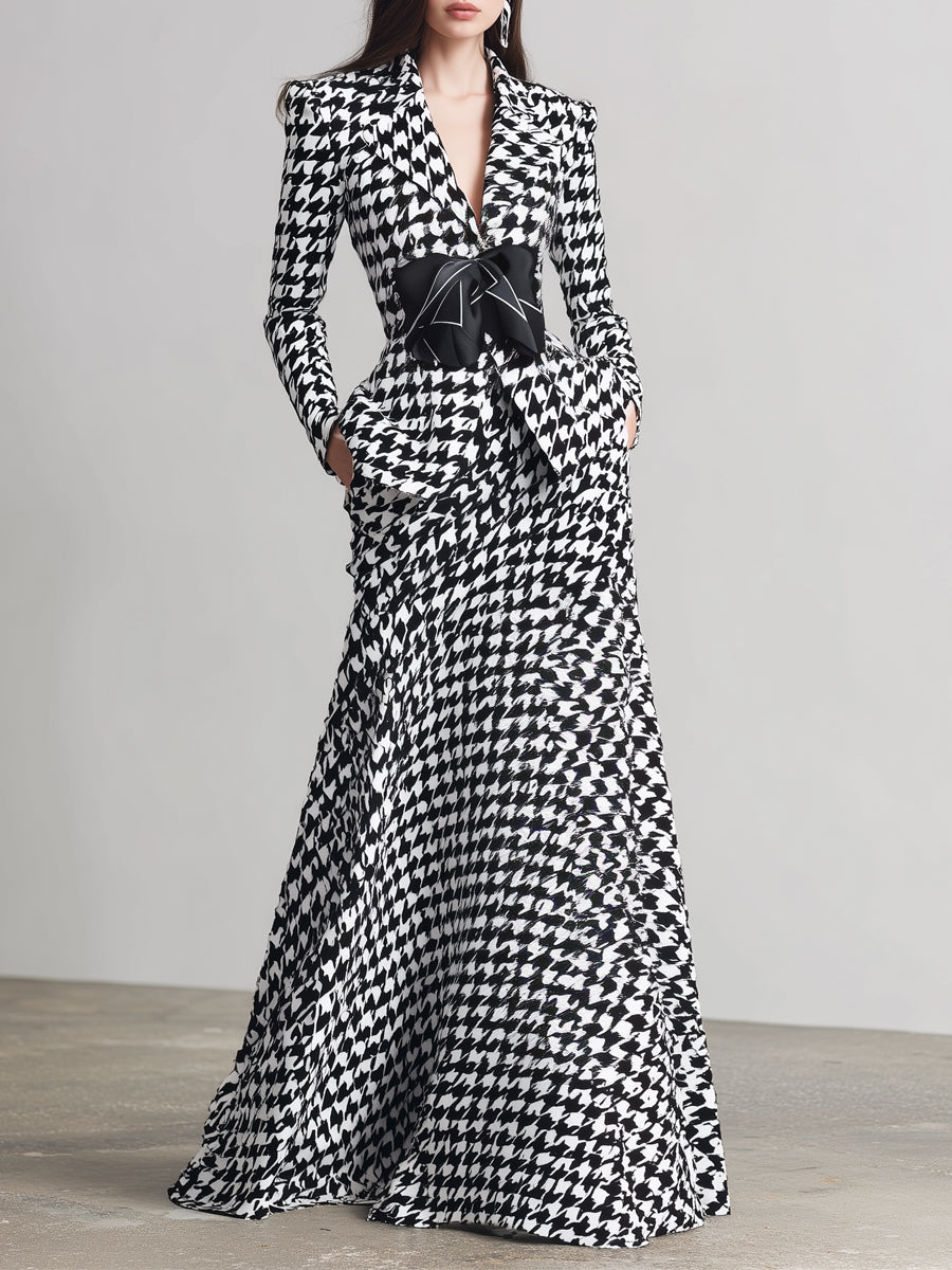Women's Black And White Houndstooth Bow-Decorated Long A-Line Suit With Concealed Buttons