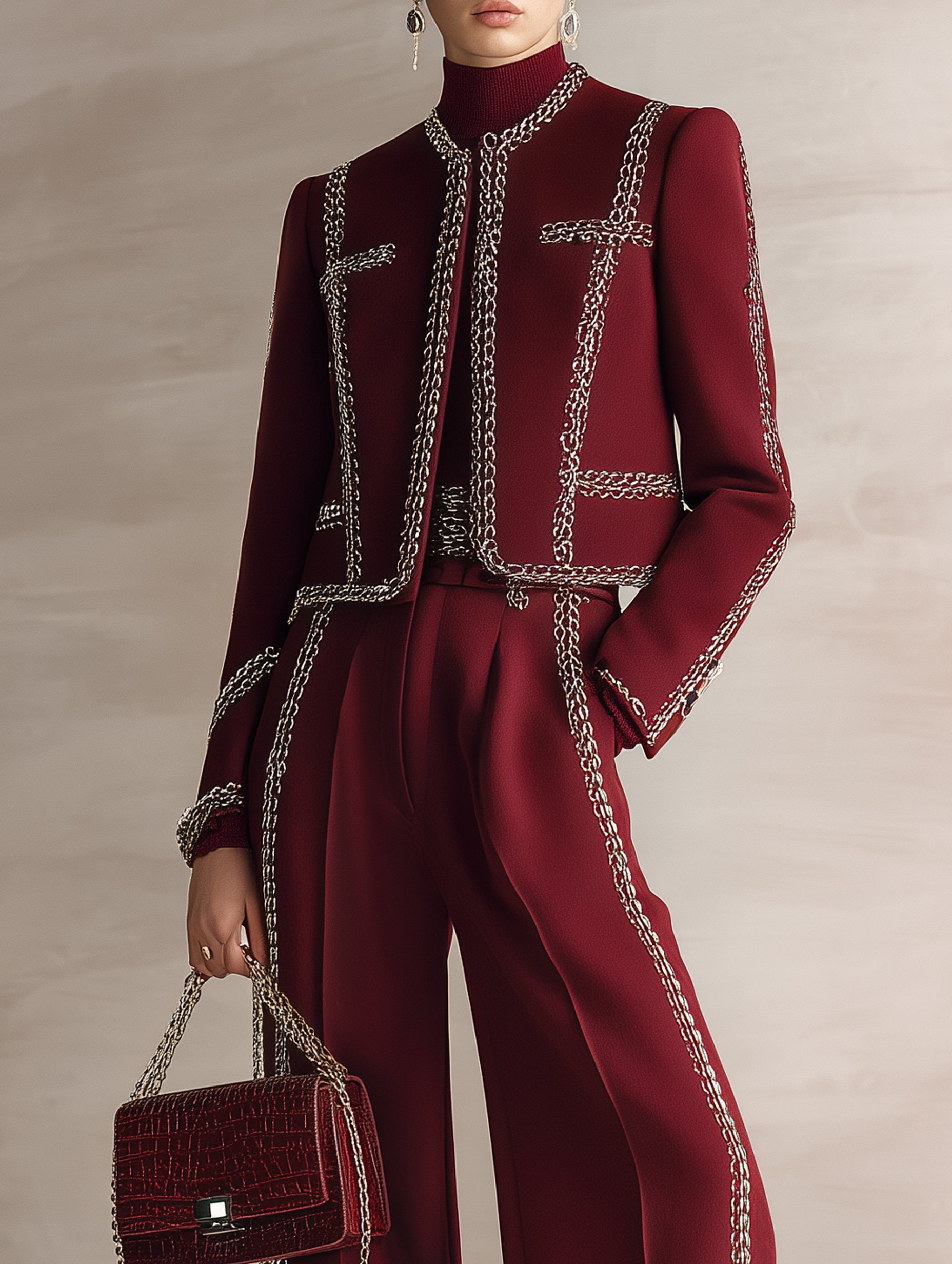 Women's Burgundy Red Ribbon-Trimmed Short Jacket Fashionable Casual Suit