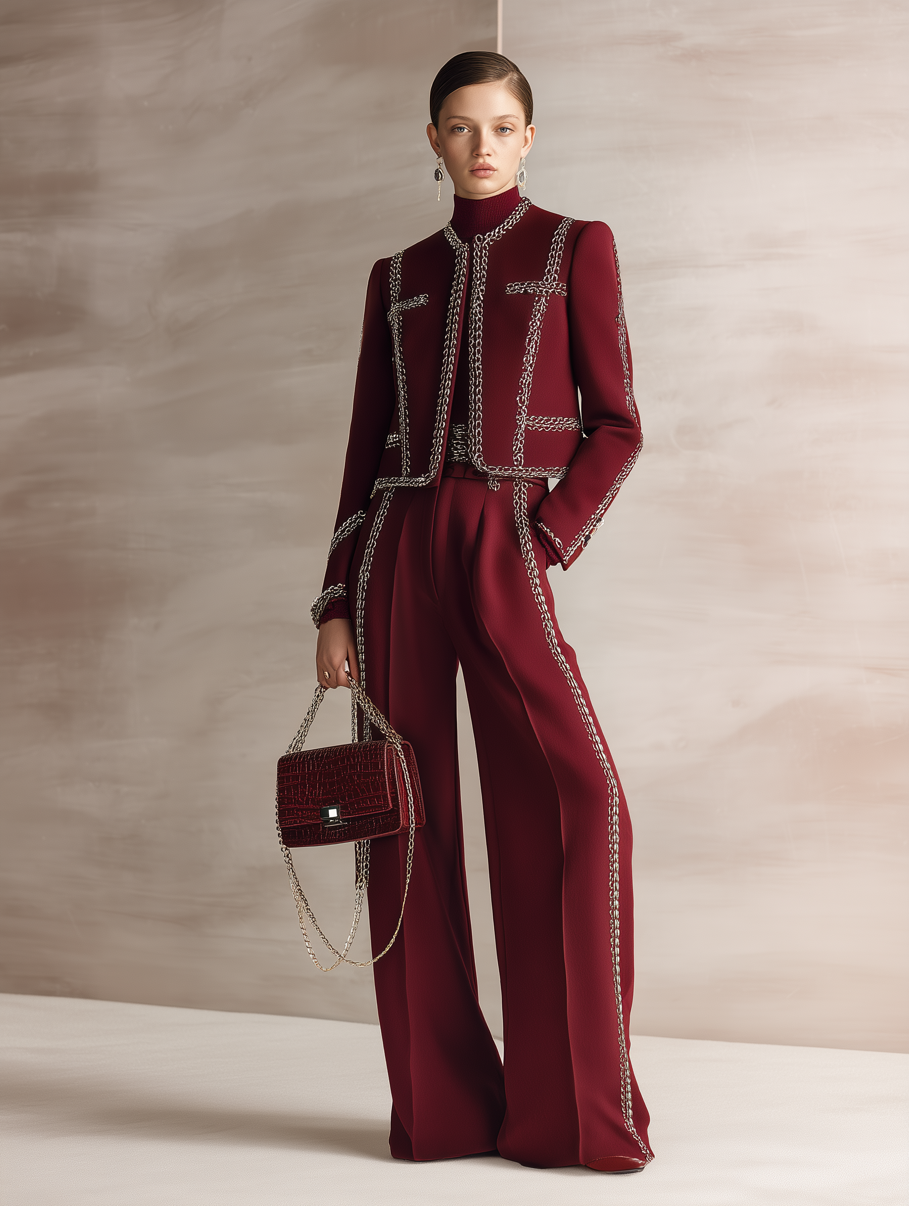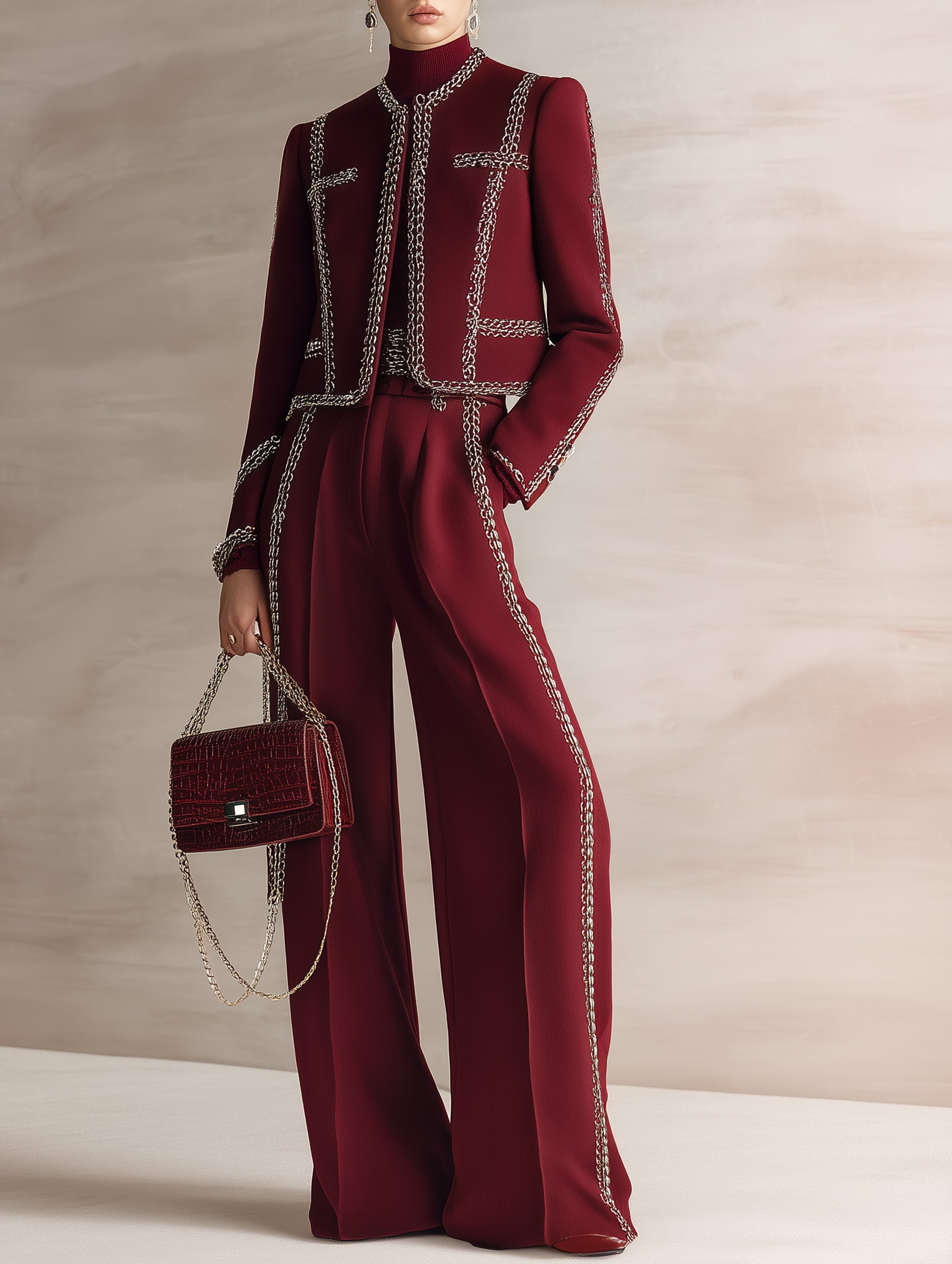 The Women's Burgundy Red Ribbon-Trimmed Stand Collar Short Jacket and Wide-Leg Pants Fashionable Casual Suit is a chic ensemble that combines traditional elegance with modern flair. The suit is constructed in a rich burgundy hue that exudes sophistication and versatility. The standout feature of the jacket is its distinctive ribbon-trimmed stand collar, offering an elegant touch that elevates the entire look.