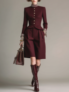 This luxurious women's two-piece suit in a rich burgundy hue offers a charming blend of retro court-style elegance and modern practicality. Crafted from high-quality woolen fabric, this ensemble includes a fitted waist blazer and chic wide-leg trousers, perfect for enhancing your commuting style.