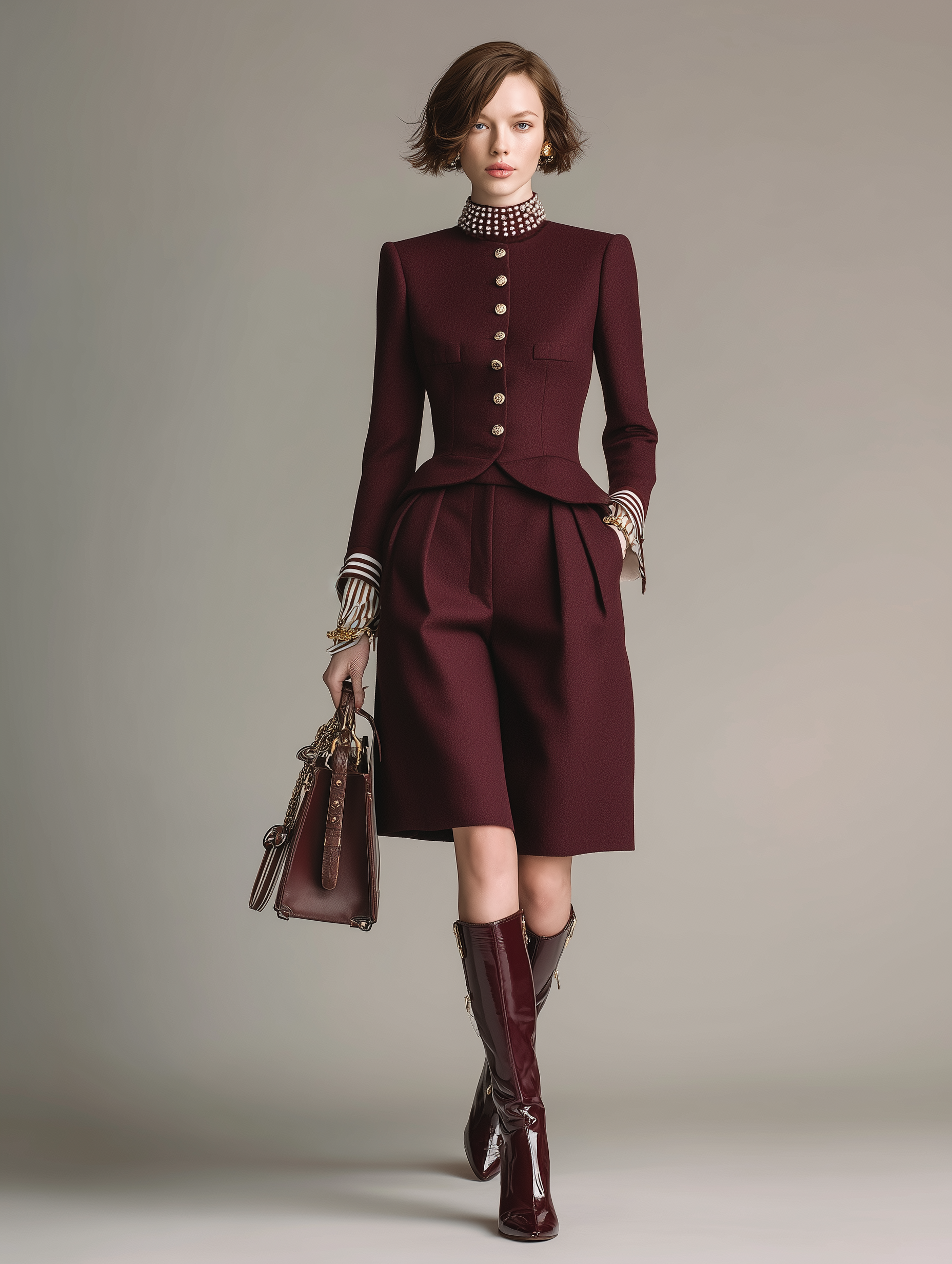 Women's Burgundy Slim-Fit Waistline Vintage Court-Style Luxury Wool Two-Piece Suit, Paired With Commuter Wide-Leg Trousers