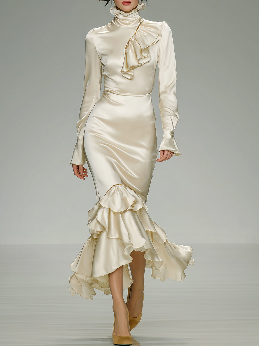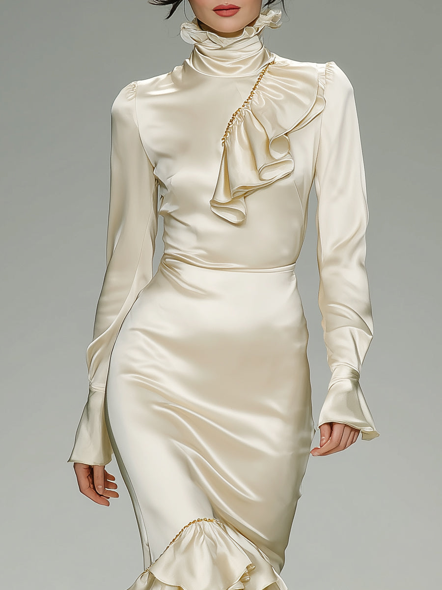 Women's Champagne White Ruffled Decorated Top Elegant Fishtail Maxi Skirt