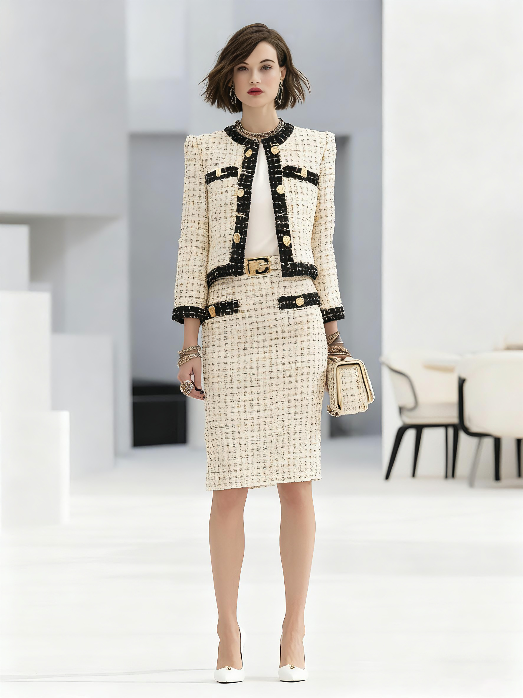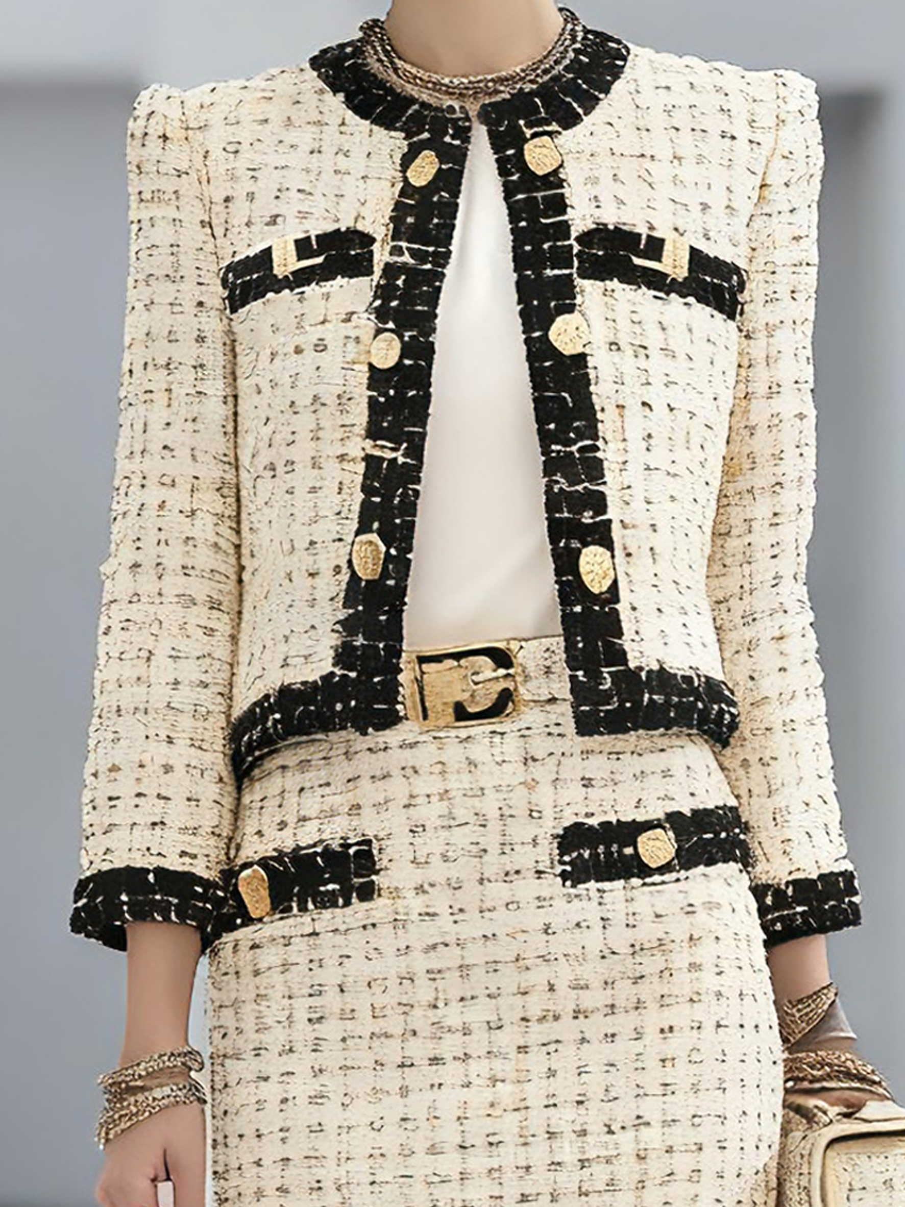 - Elegant Gold Buttons: The gold buttons on the jacket add an extra layer of sophistication and opulence, tying together the classic Chanel-inspired look.