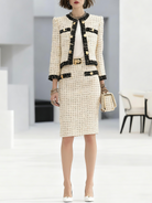 This Women's Chanel-inspired Tweed Suit offers a classic and sophisticated look, perfectly capturing the essence of elegance and professionalism. The set includes a chic short jacket and a matching pencil skirt, designed with a refined beige and black color-block pattern. The jacket features luxurious gold buttons, adding a touch of glamour to the overall ensemble.