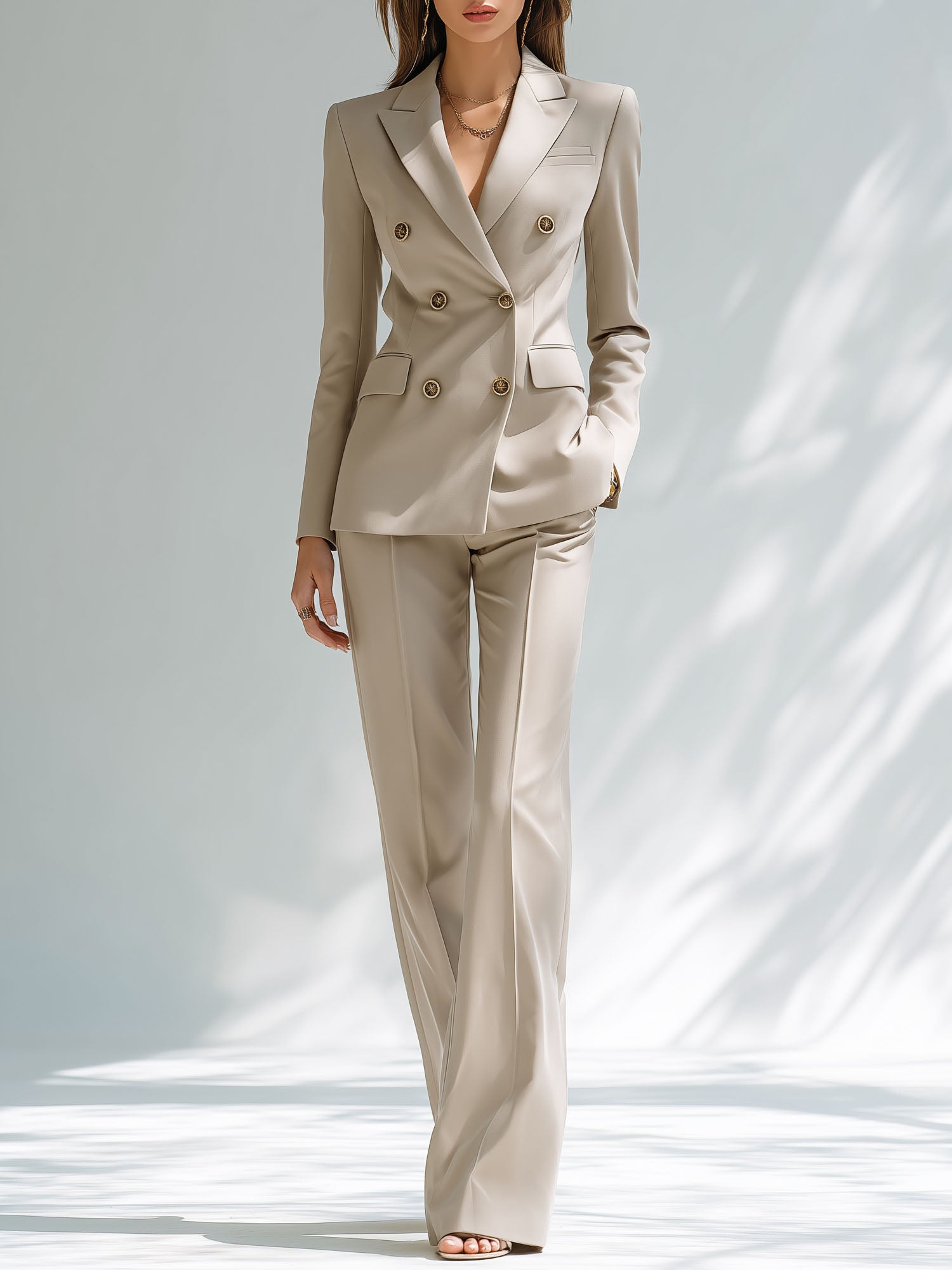 Women's Fashionable And Elegant Light Khaki Double-breasted Wide-leg Pant Suit