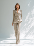 This Women's Fashionable and Elegant Light Khaki Double-breasted Wide-leg Pant Suit epitomizes modern sophistication with a classic twist. The set consists of a tailored blazer and complementing wide-leg pants, both designed to provide a flattering silhouette that enhances the wearer's confidence and poise.