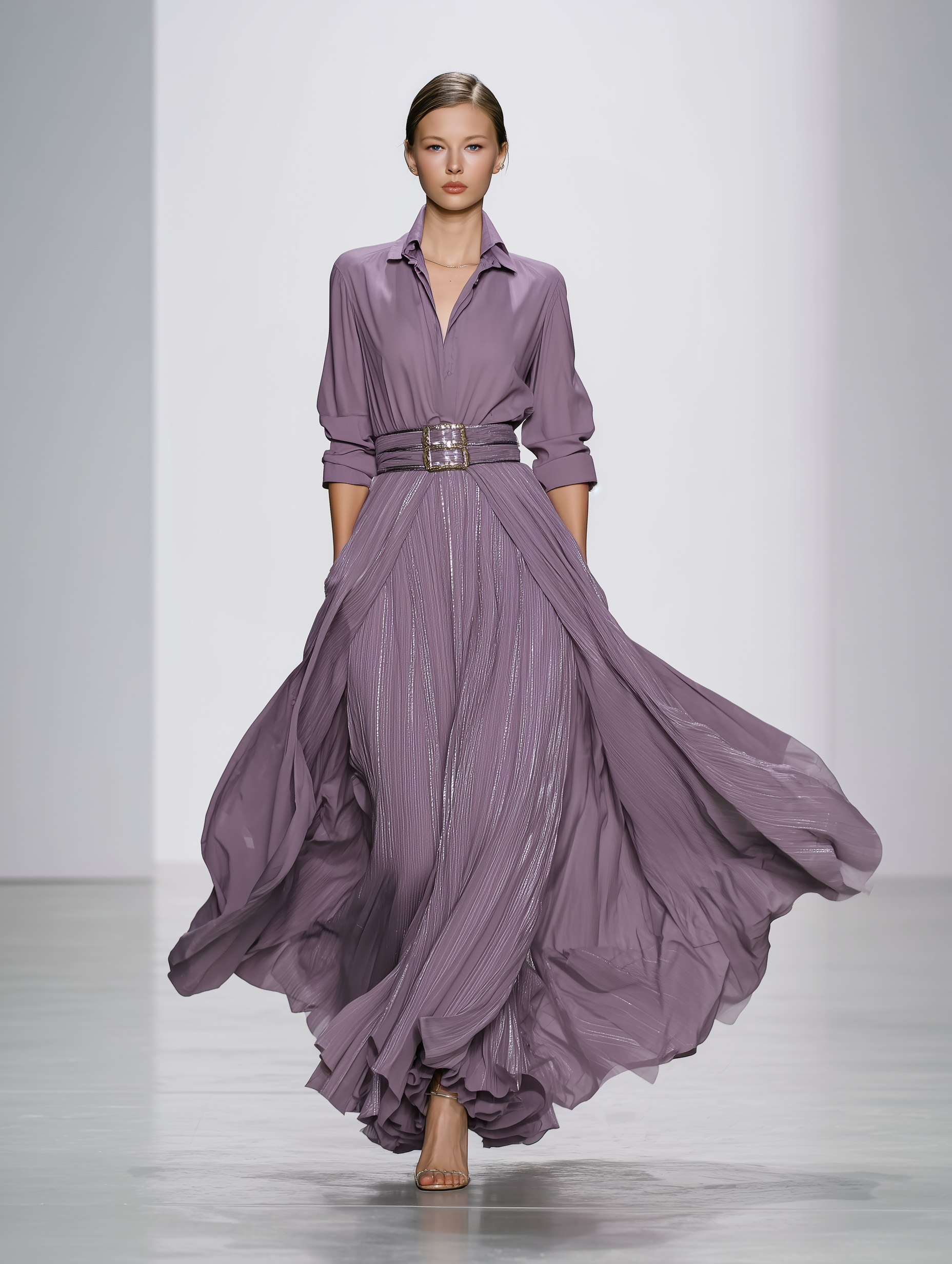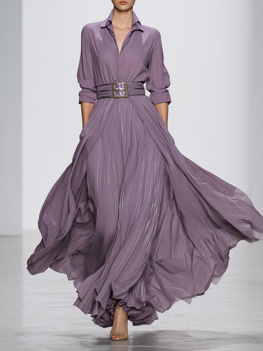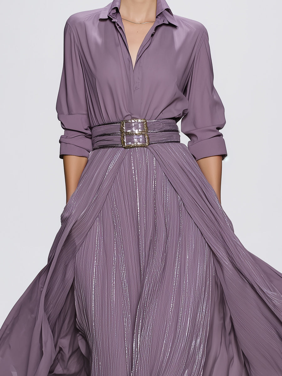 This elegant fashion set features a women's gray purple shirt combined with a long mercerized pleated skirt. The shirt is tailored for a flattering fit, providing both comfort and style. The luxurious fabric of the shirt, paired with the rich color, ensures a sophisticated look suitable for any occasion. Complementing the shirt is the long pleated skirt, designed with a mercerization process that gives it a shiny, polished appearance, enhancing the overall elegance of the outfit.