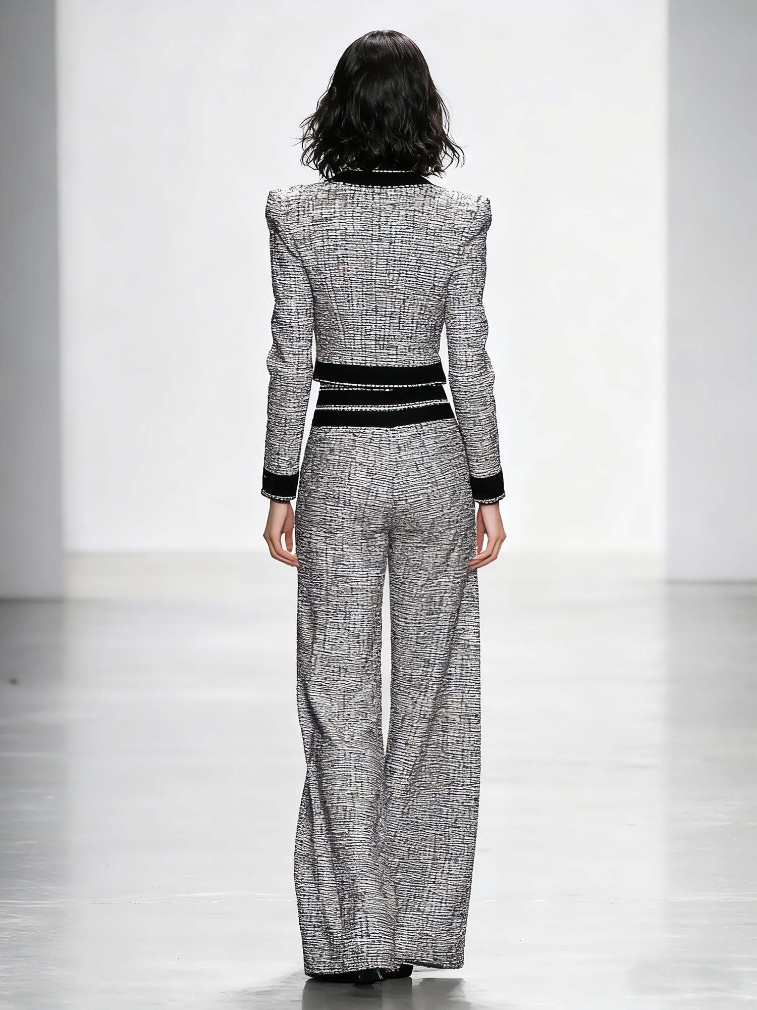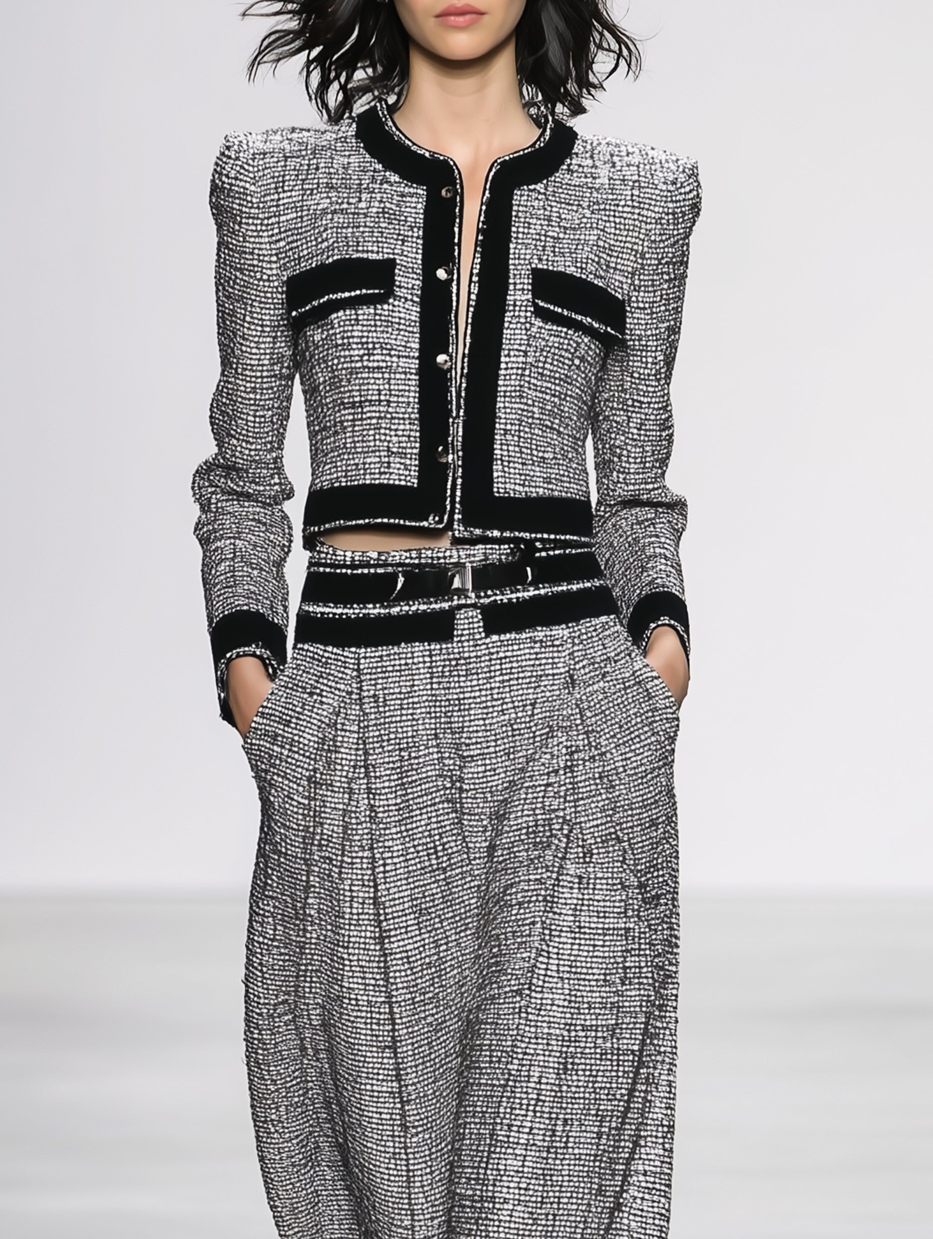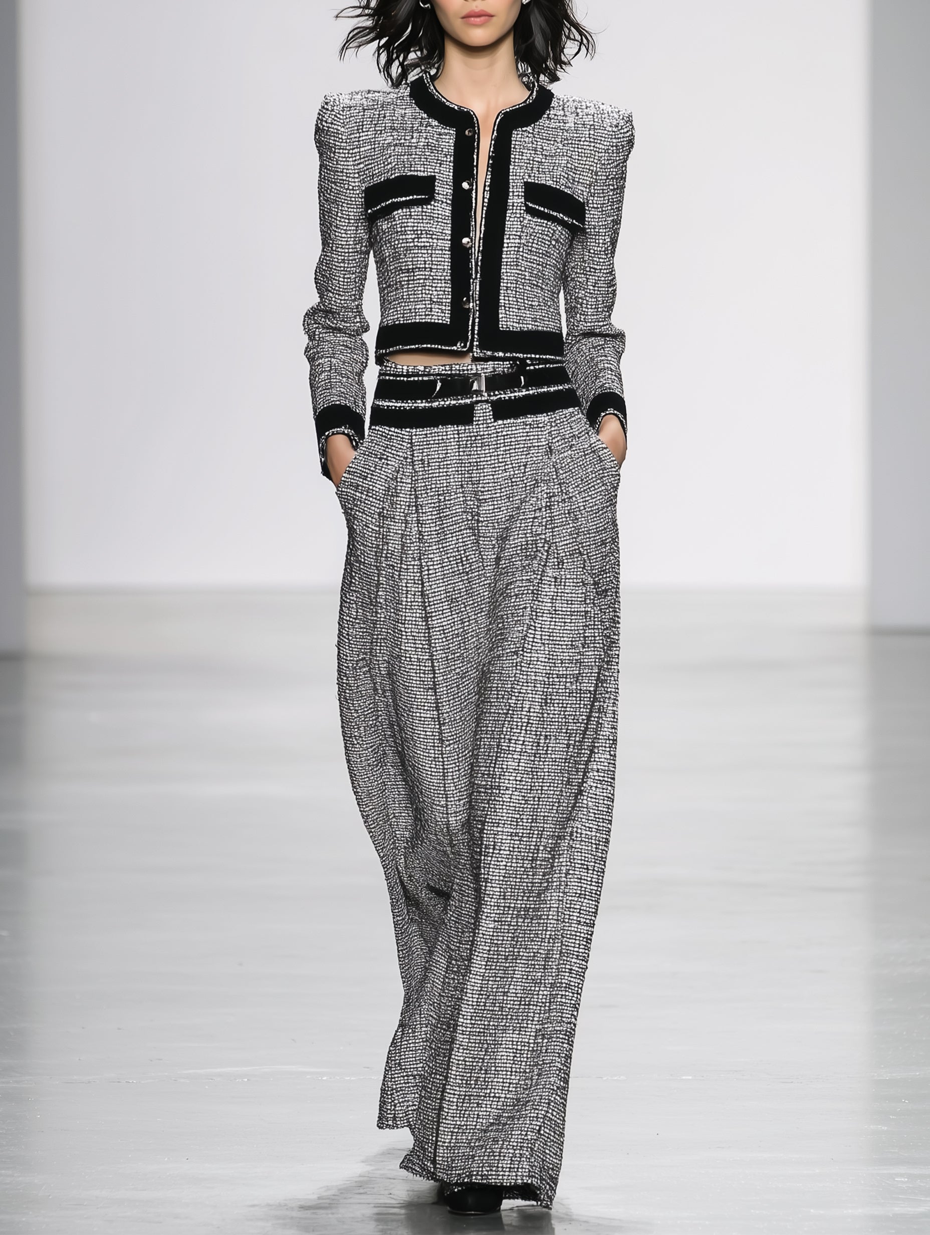 Women's Grey Tweed Pants With Black Piping Trim: Stylish And Elegant Suit