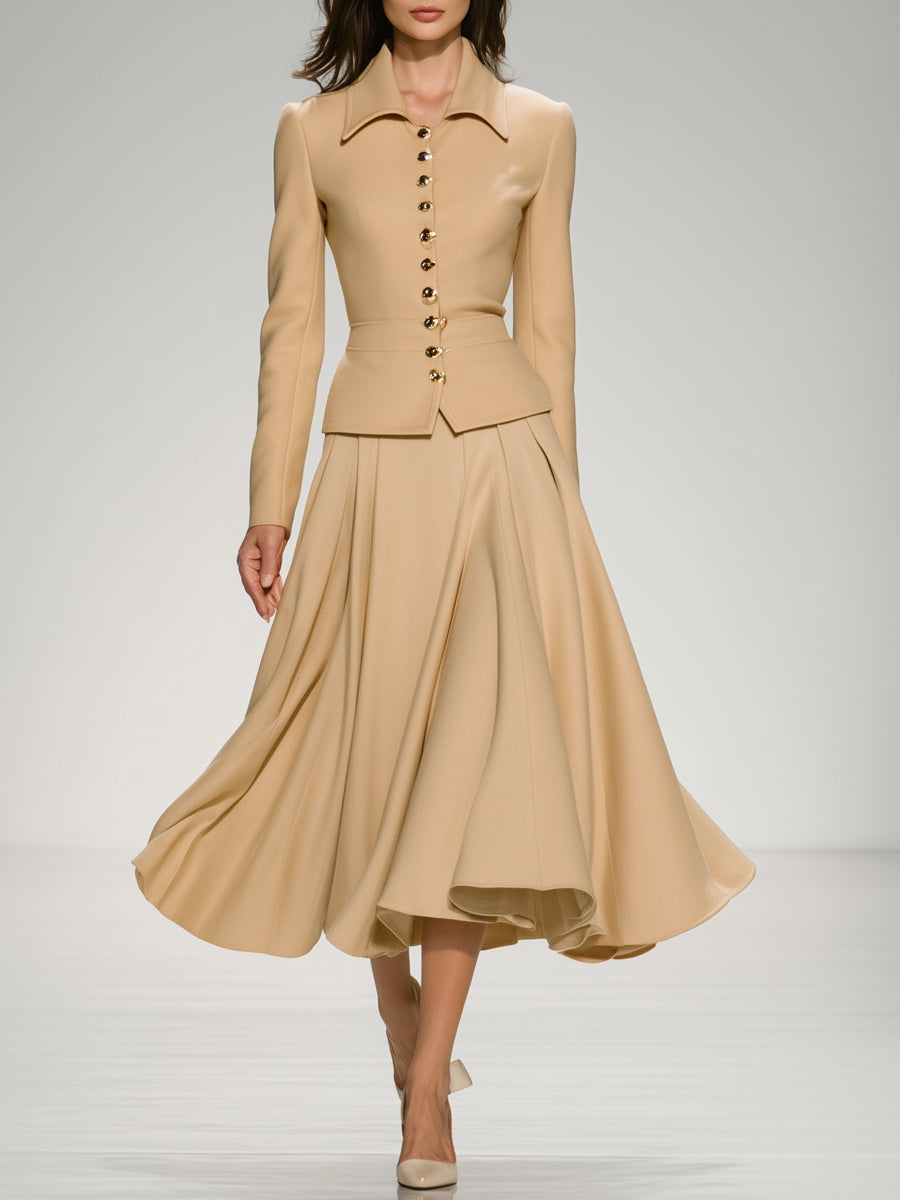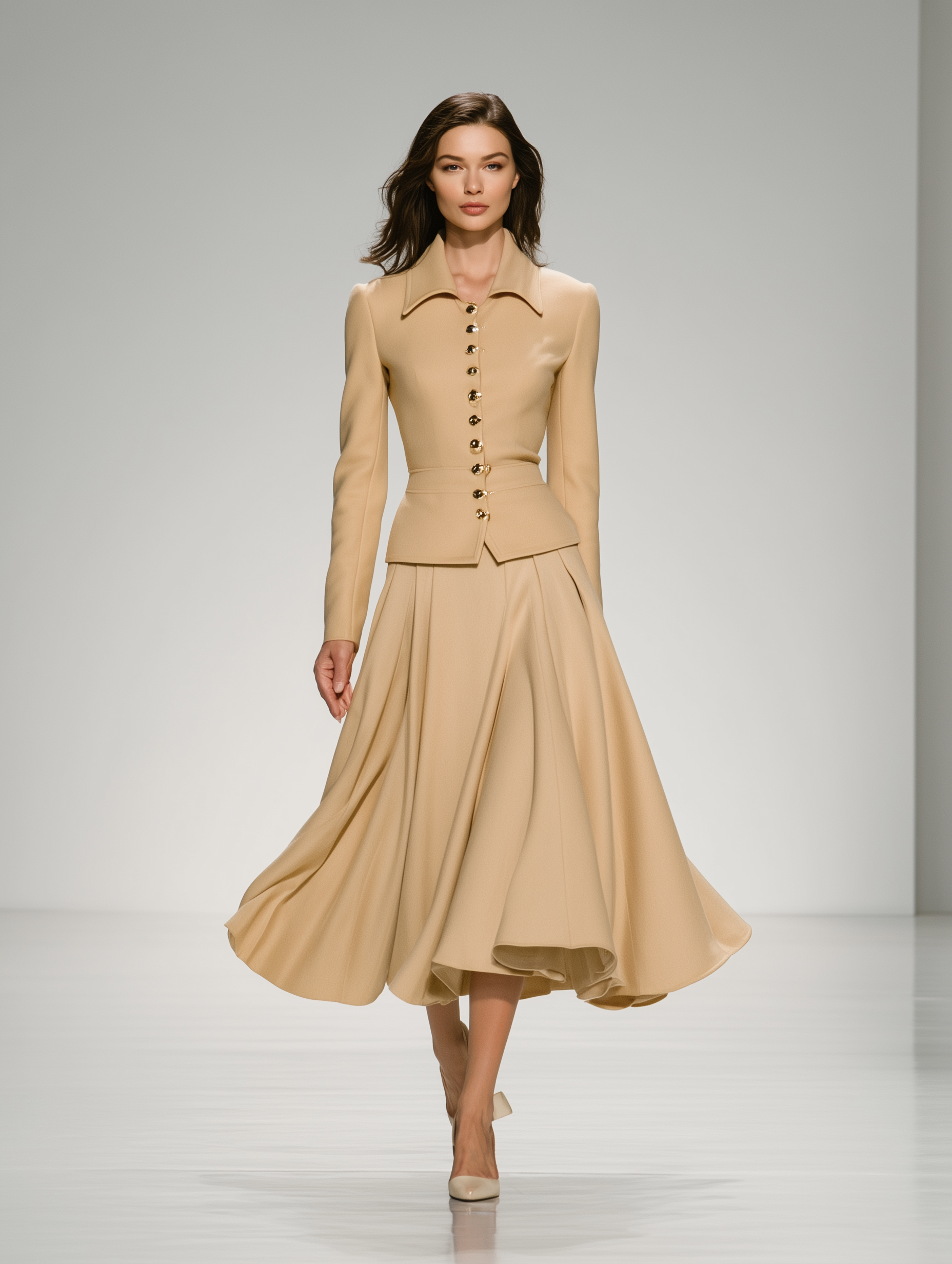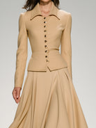 This Women's Khaki Slim Fit Wool Short Top and Elegant A-line Skirt Set embodies sophistication and style. The set features a chic design, characterized by a sleek wool short top and a graceful A-line skirt, perfect for various occasions.