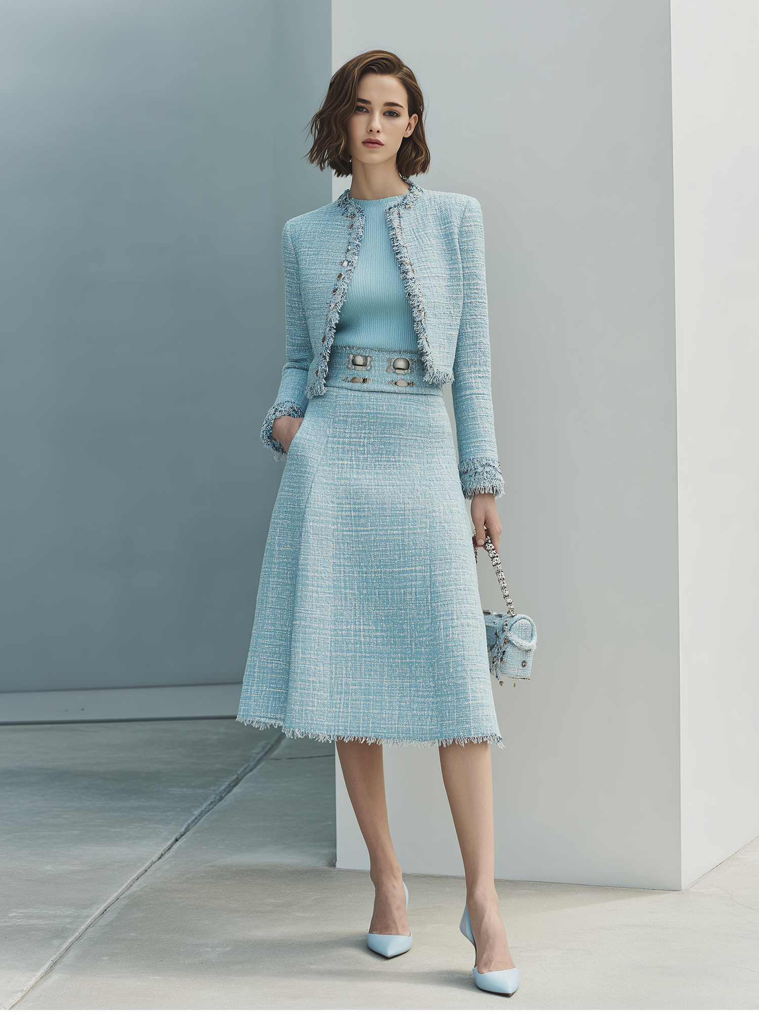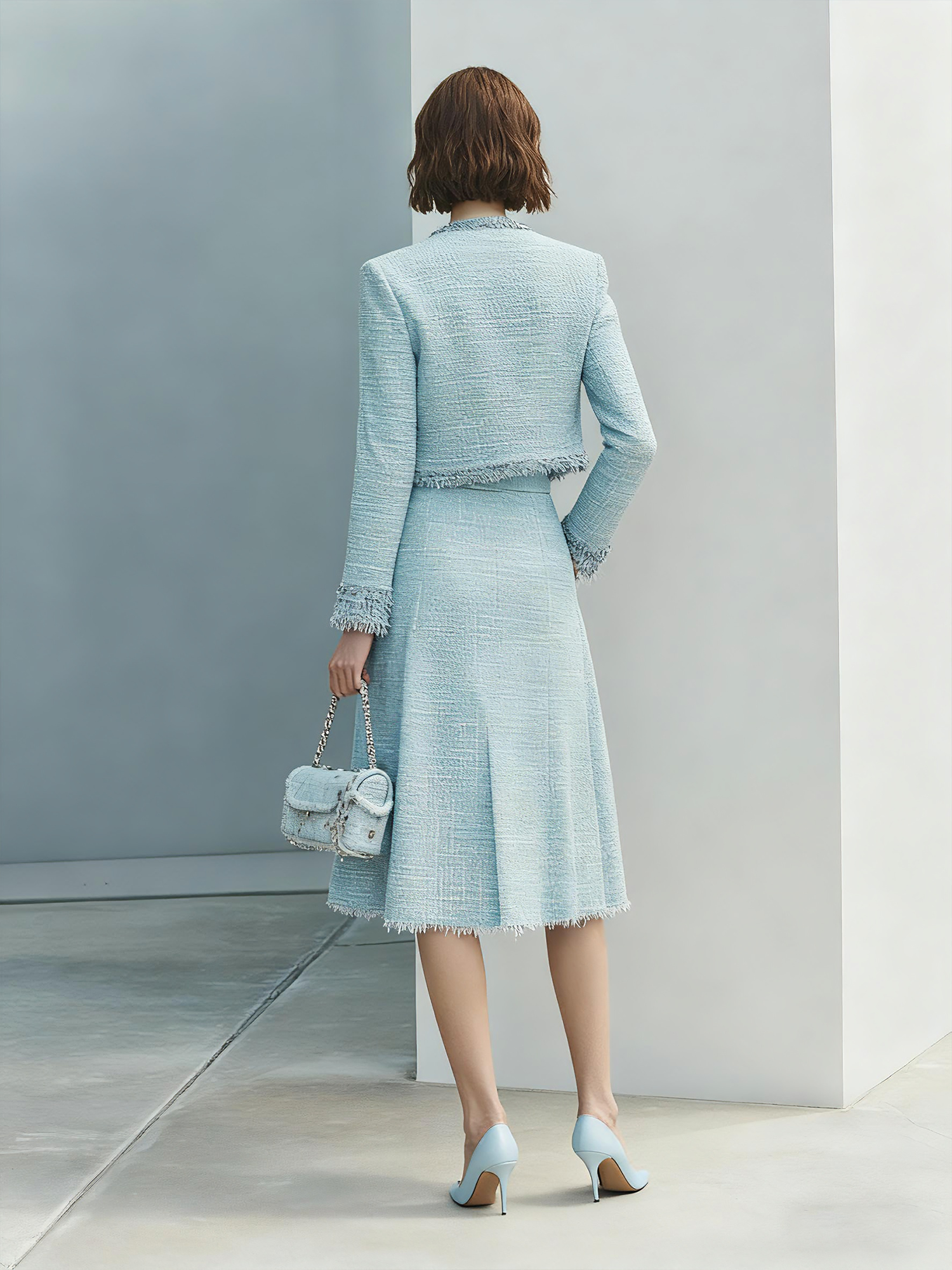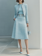 Women's Light Blue Tweed Elegant Chanel-style Two-piece Suit With High-waisted A-line Skirt.