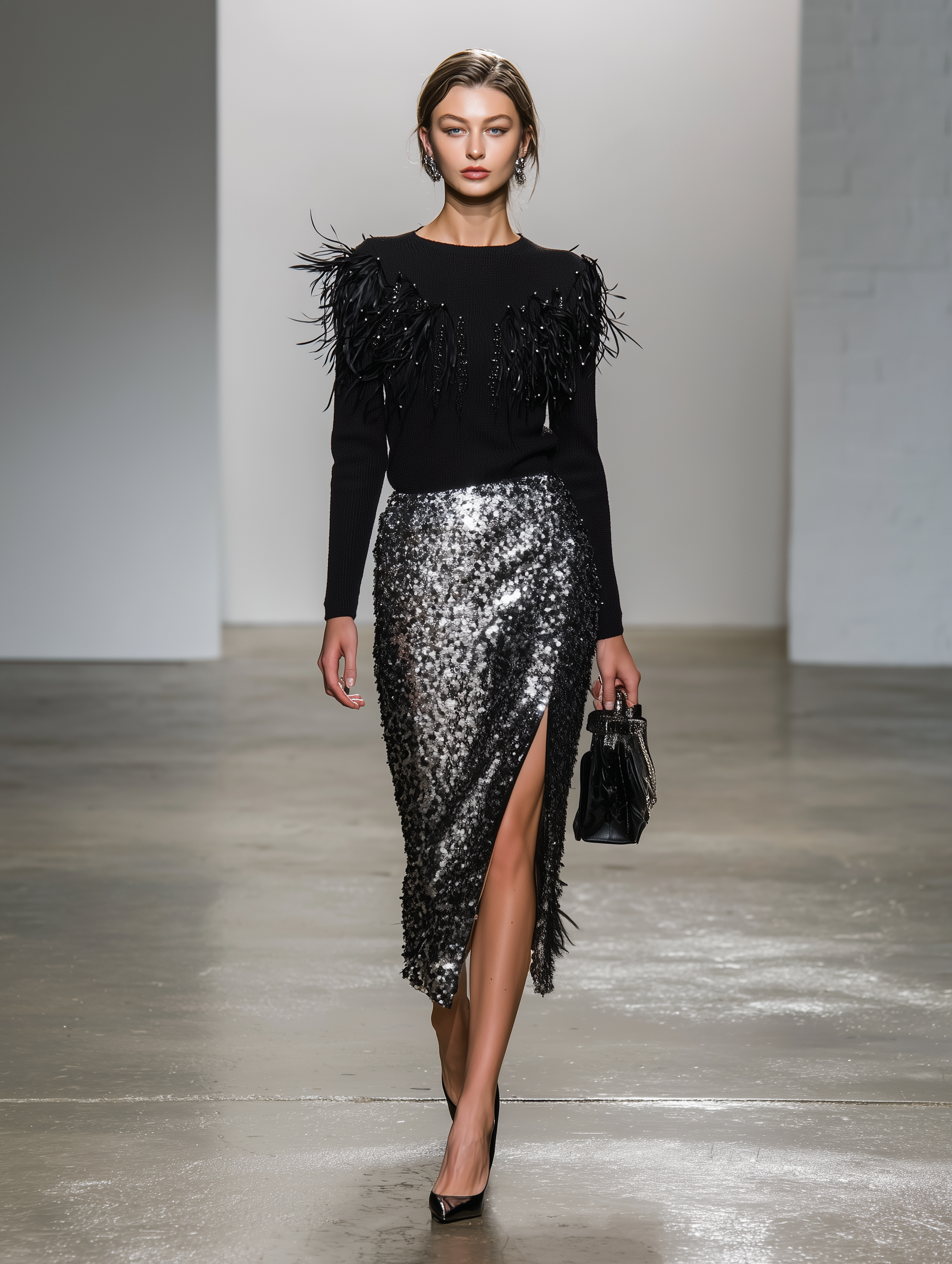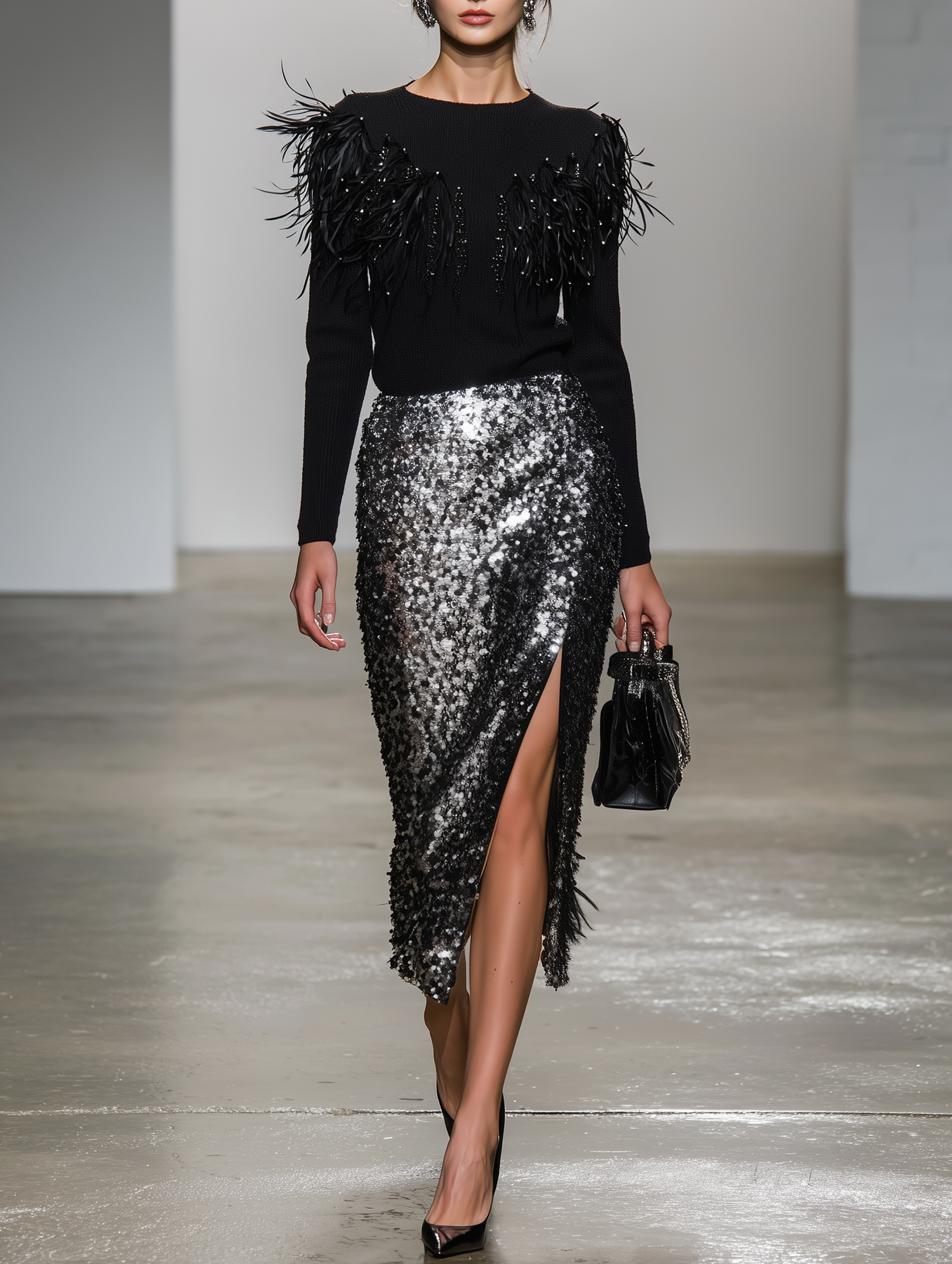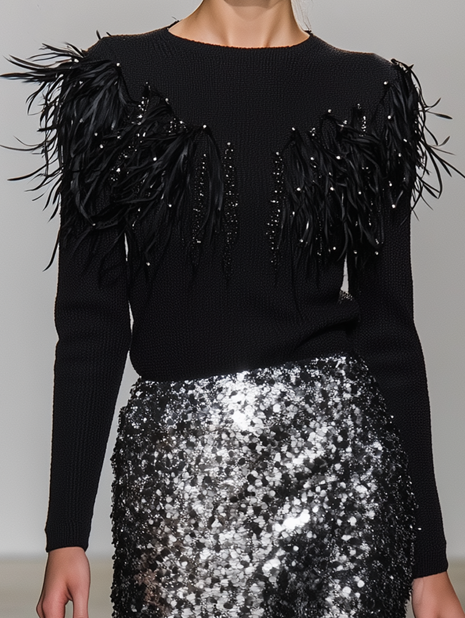 Women's Modern And Elegant Feather-trimmed Knit Top And Silver-black Sequined Skirt Set