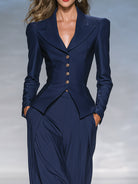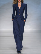 Women's Navy Blue Side-Patch Fitted Blazer And Wide-Leg Pants Elegant Suit