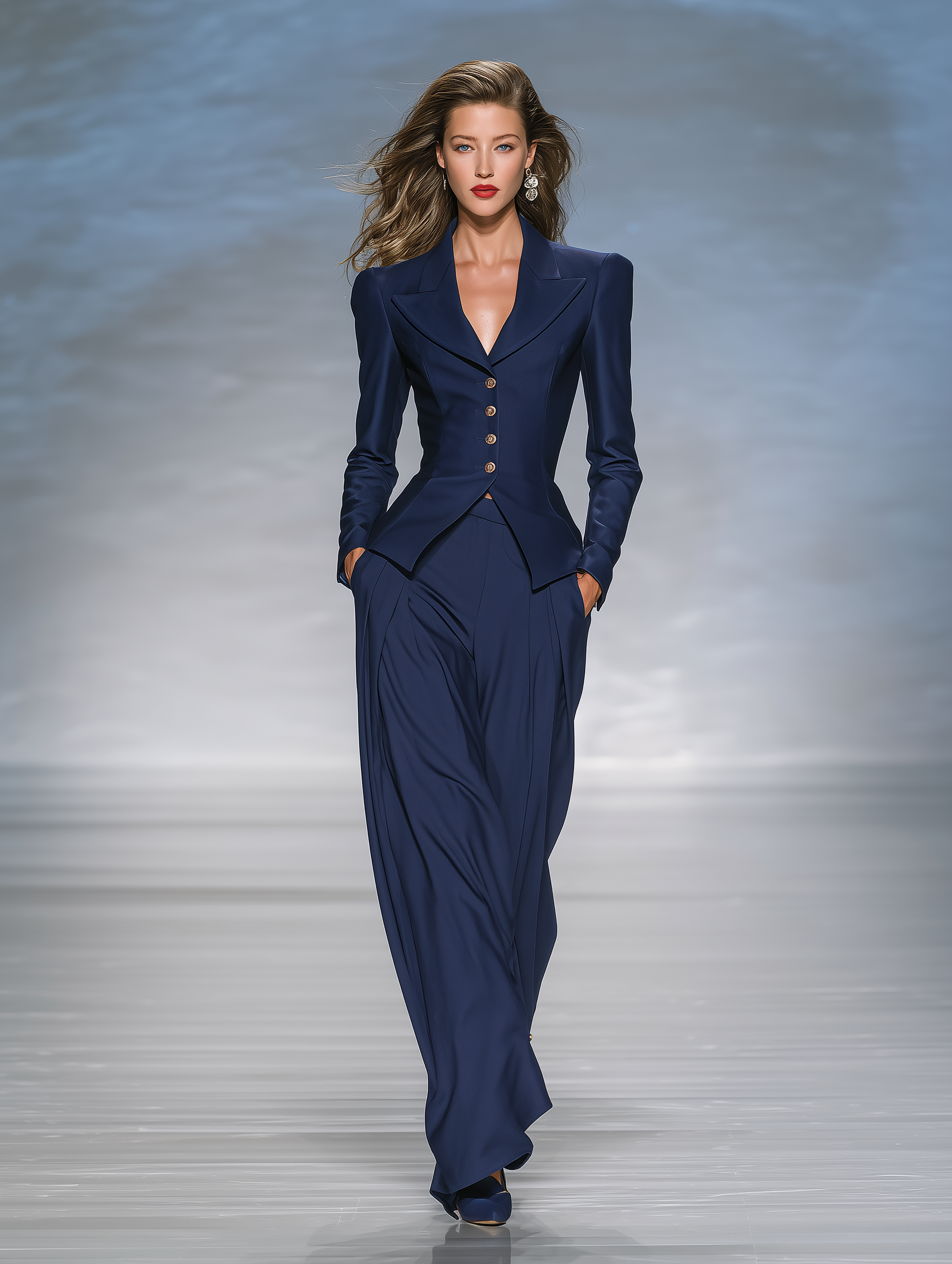 The Women's Navy Blue Side-Patch Fitted Blazer And Wide-Leg Pants Elegant Suit is a chic and sophisticated outfit perfect for both professional and formal occasions. Crafted with precision, this suit embodies elegance and style in every seam.