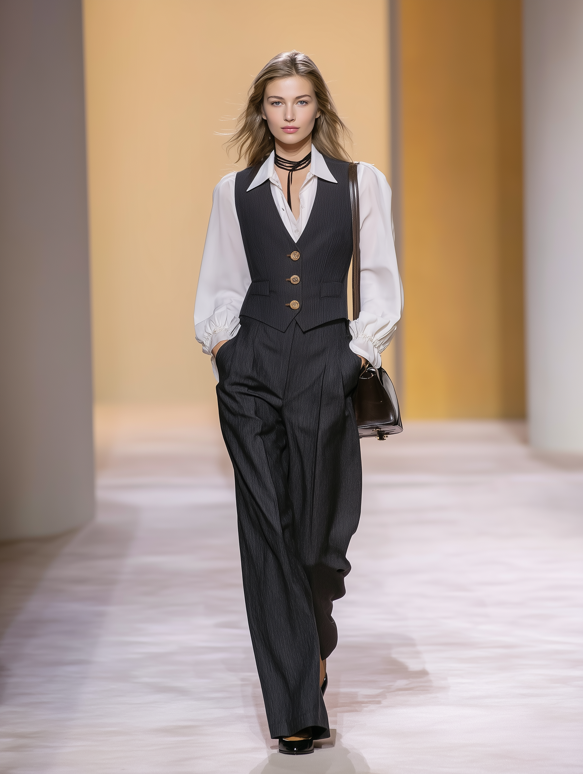 - Design: The dark gray fitted vest complements the wide-leg trousers, creating an elongated and flattering look.