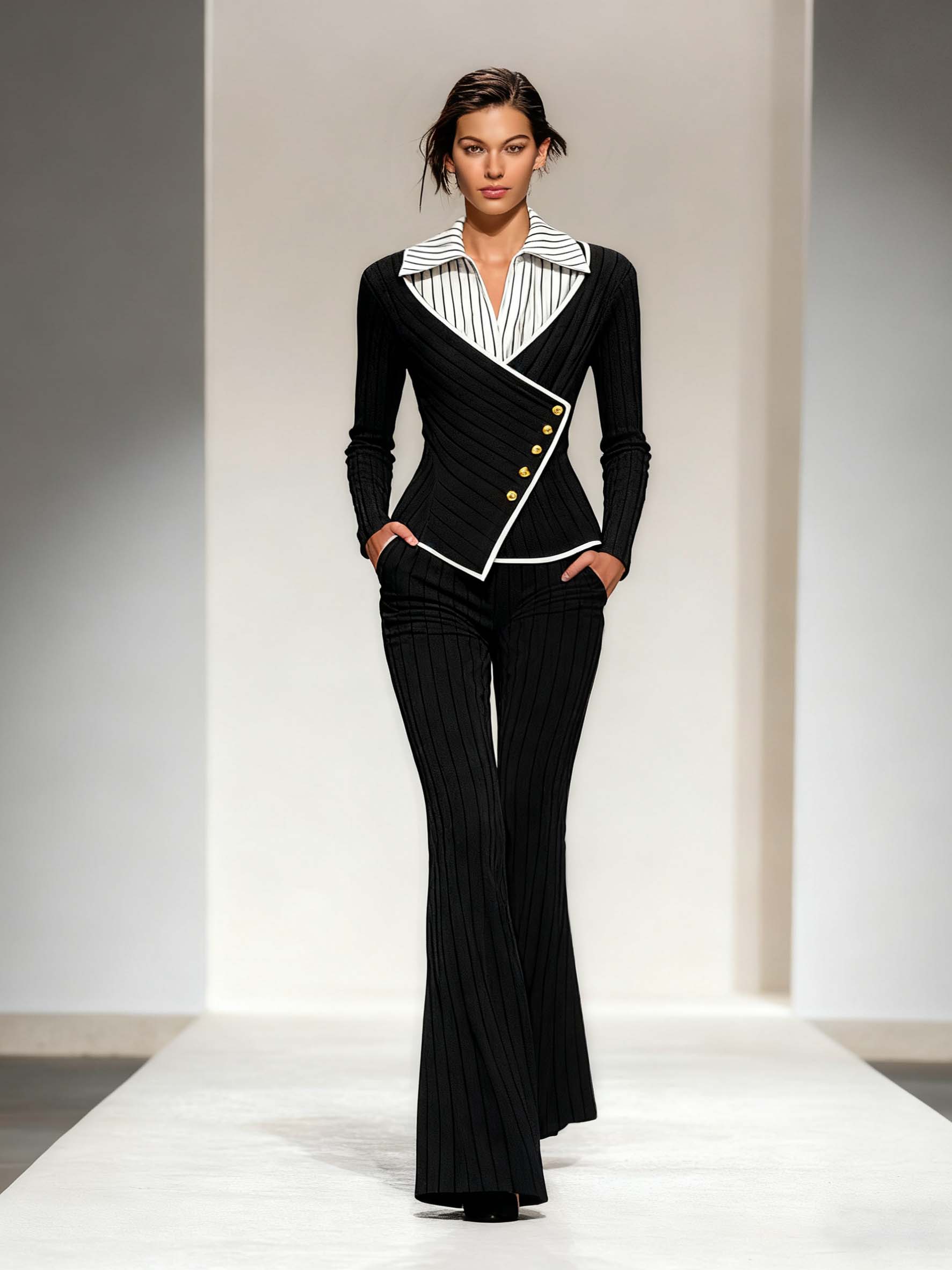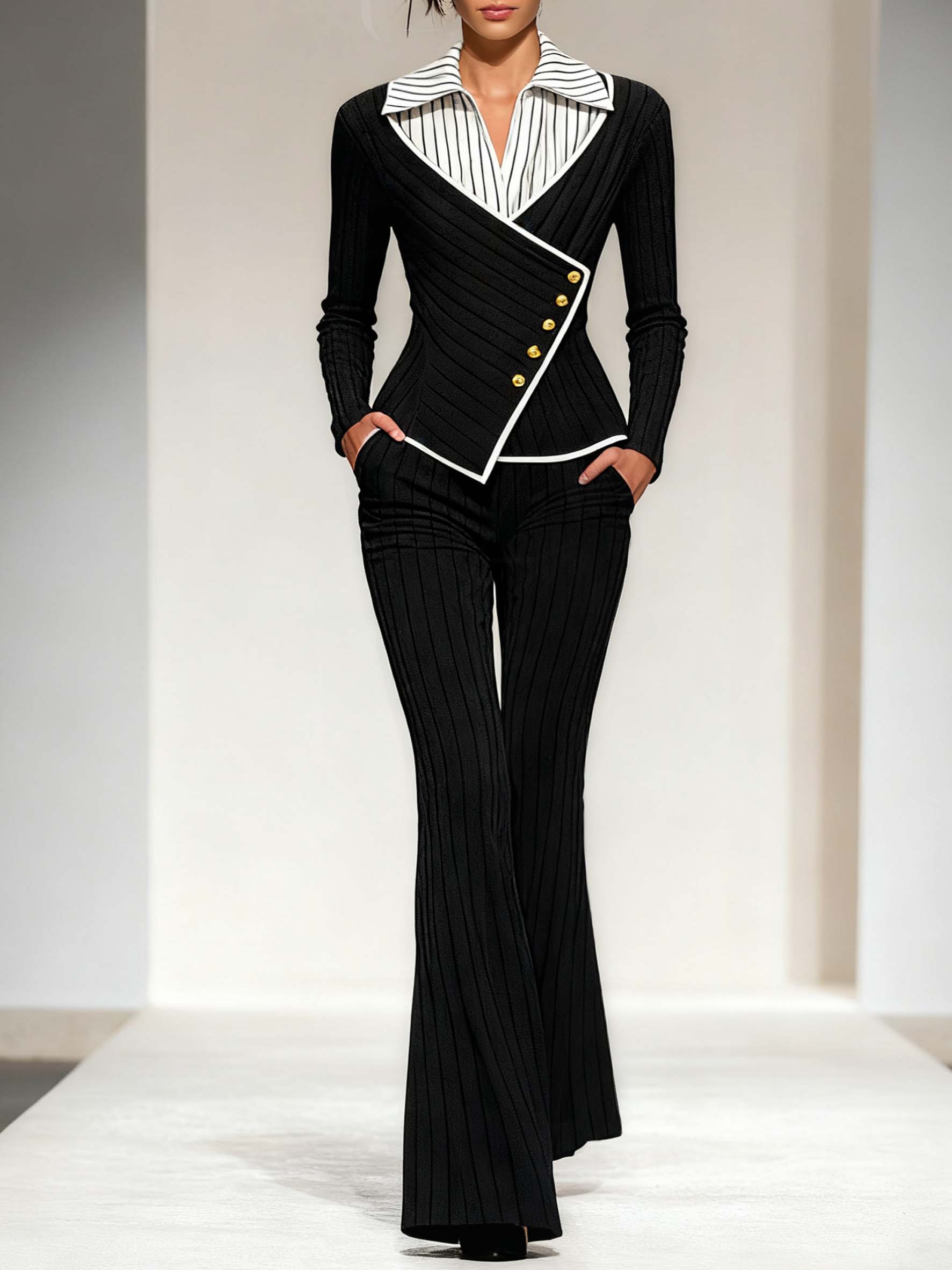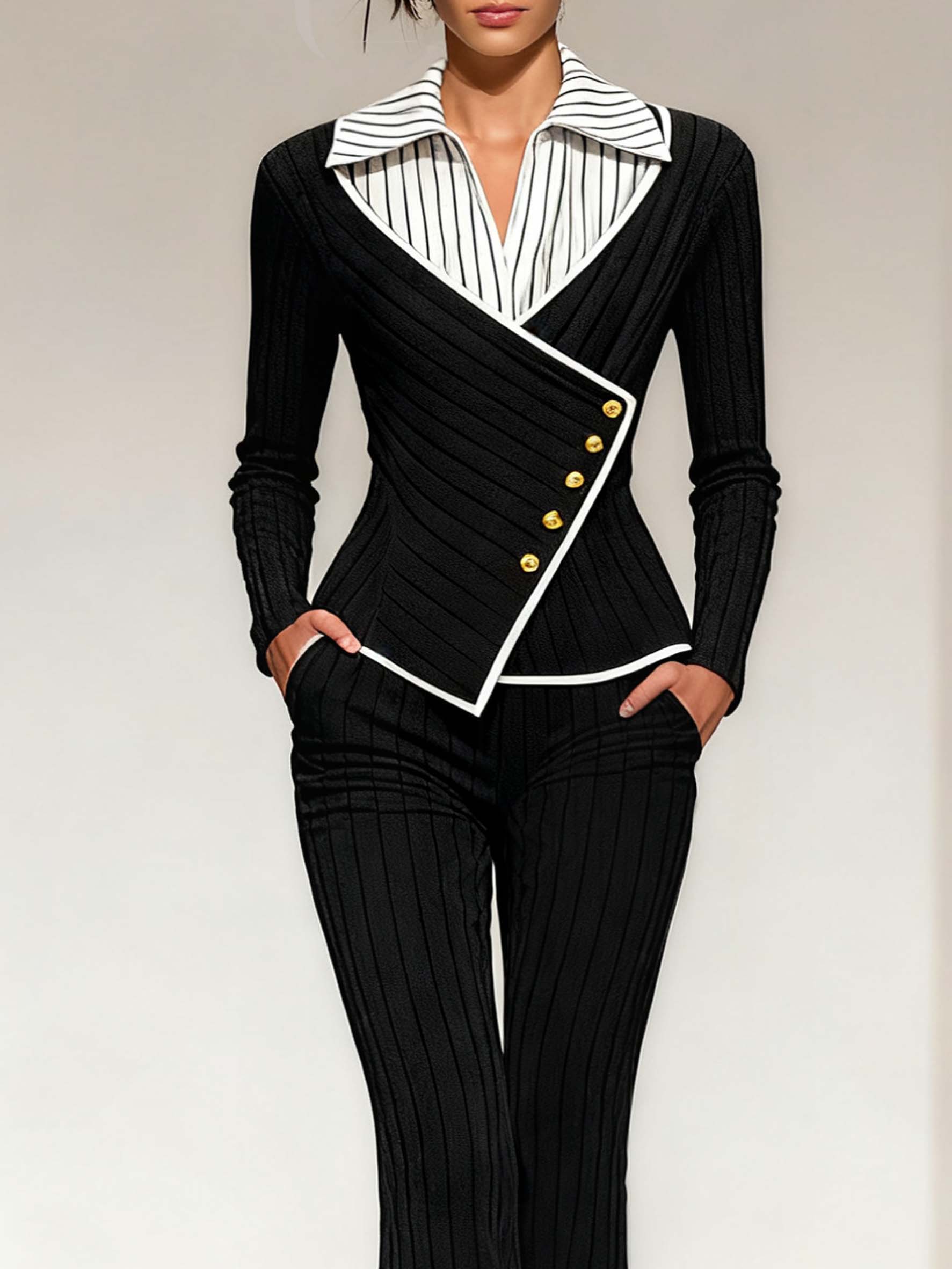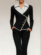 This chic ensemble features a sophisticated Women's Patchwork Striped Shirt Collar Top paired with sleek Slim-fit Black Trousers. The outfit combines classic design with modern flair, making it an excellent choice for various occasions, from business meetings to casual outings.