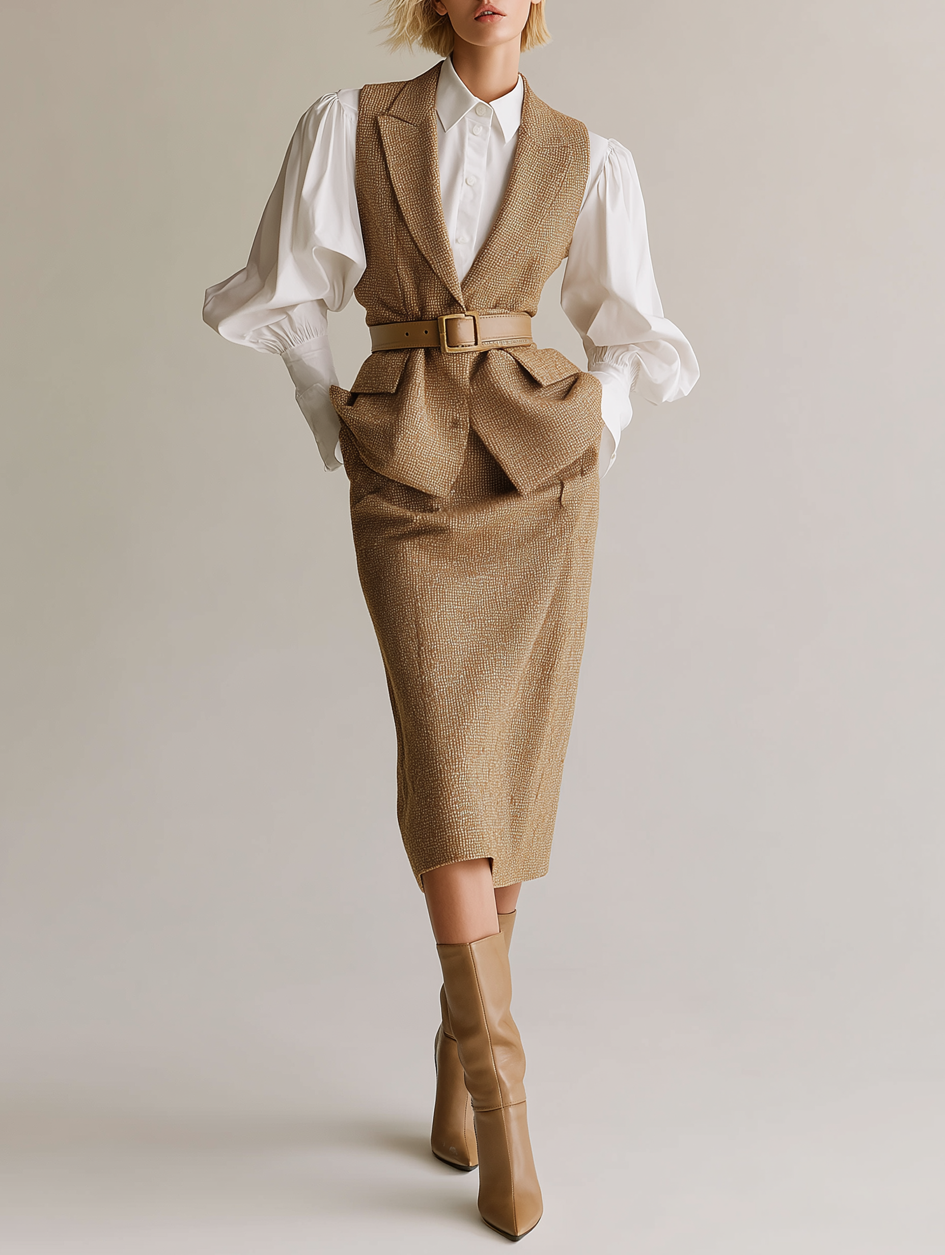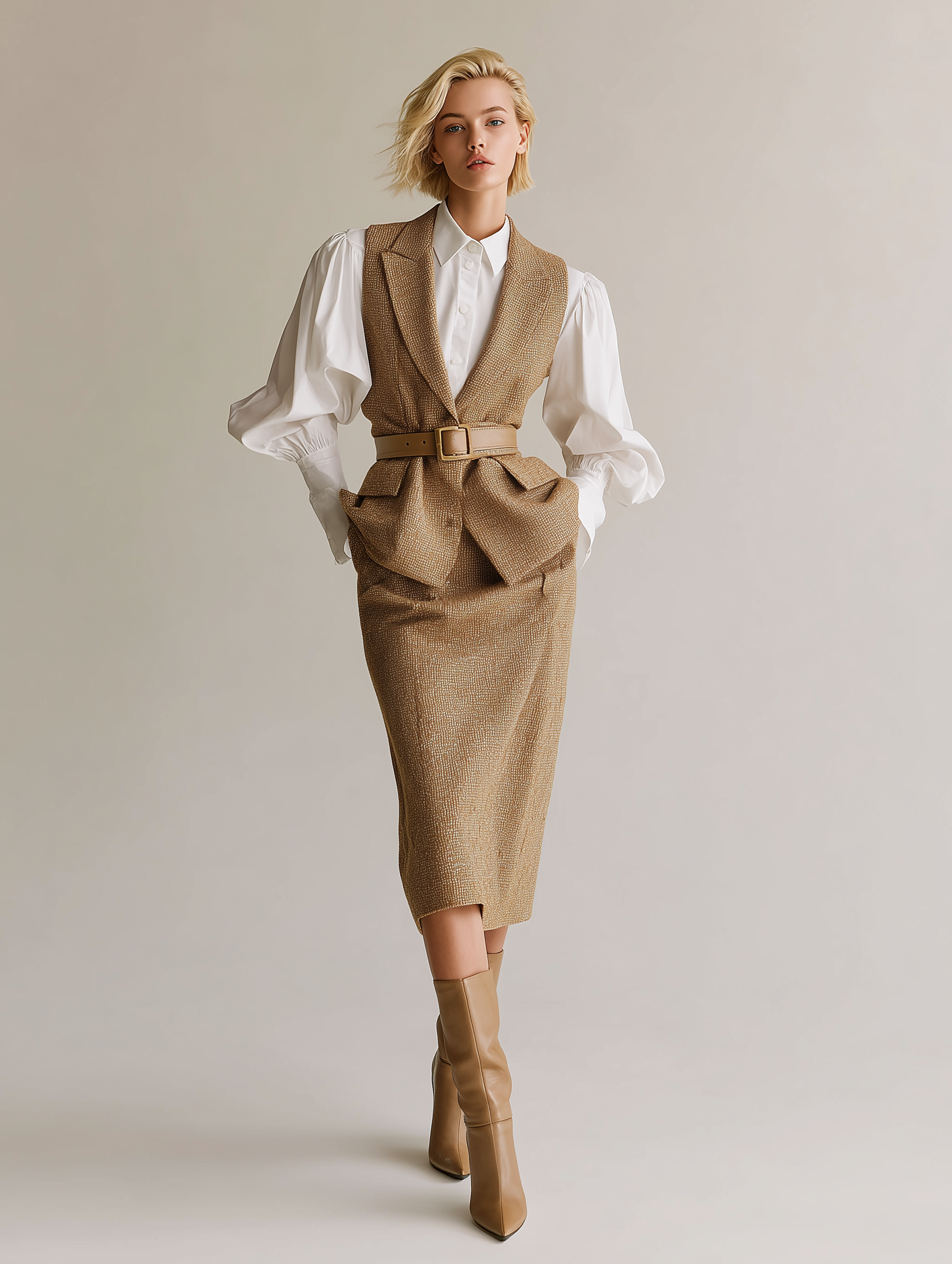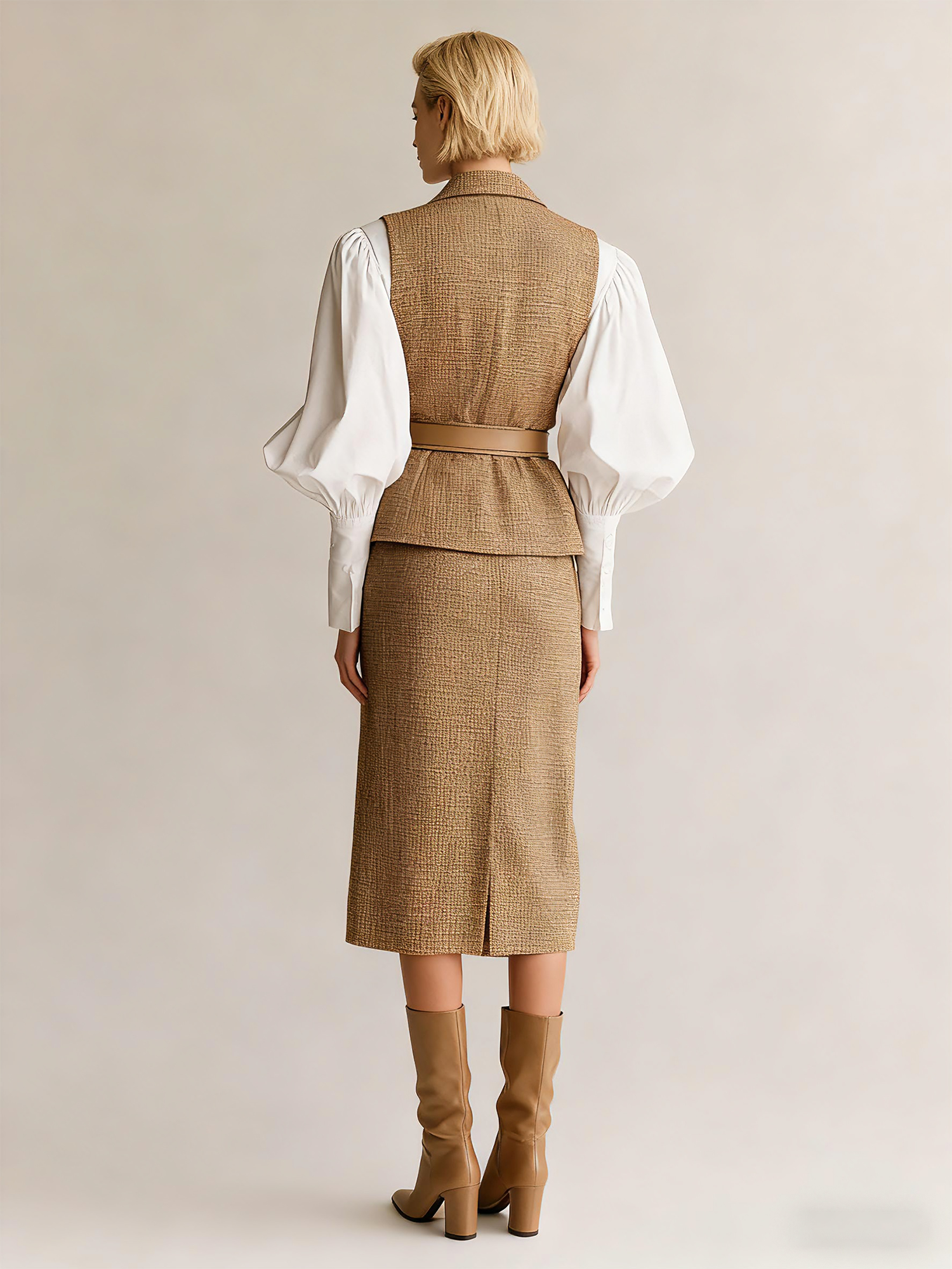 Women's Professional Tweed Three-Piece Suit With Puffed-Sleeve Blouse