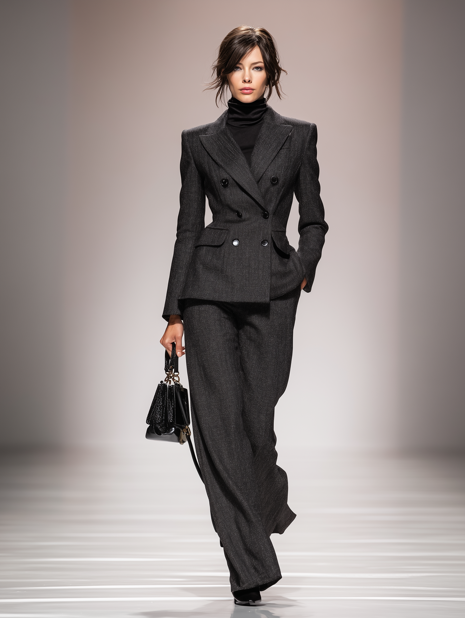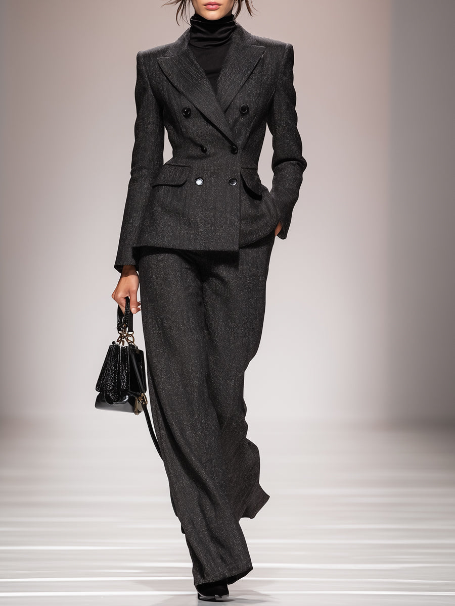 Introducing the Women's Slim-fit Suit with Wide-leg Pants in Smoky Gray. This fashionable woolen suit combines the elegance of a slim-fit blazer with the contemporary style of wide-leg pants, perfect for making a sophisticated statement. The smoky gray color adds a touch of refined grace, making this suit a versatile addition to any wardrobe.