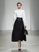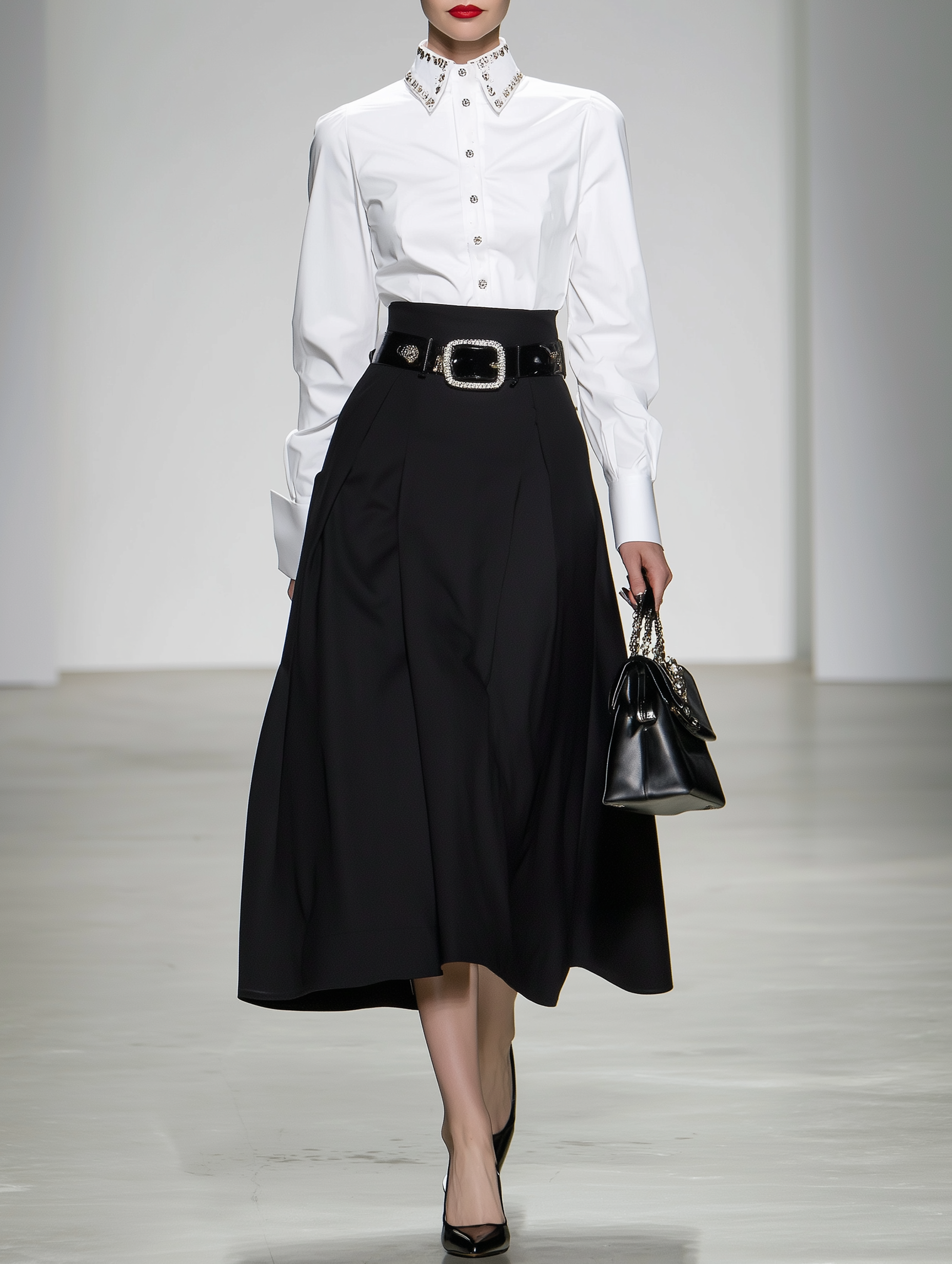 Women's Two-piece Set: White Blouse With Rhinestone Collar And High-waisted Black Skirt.
