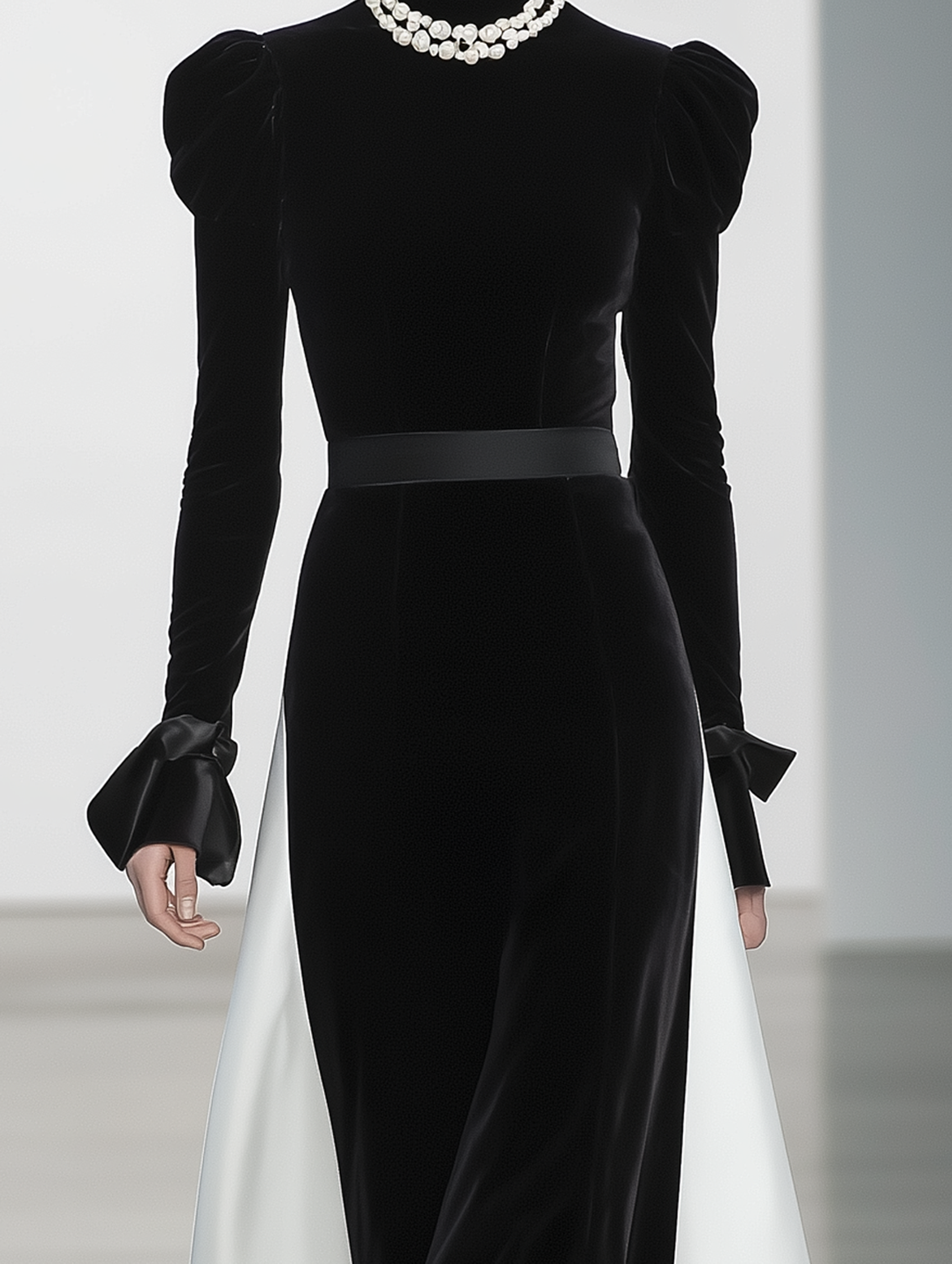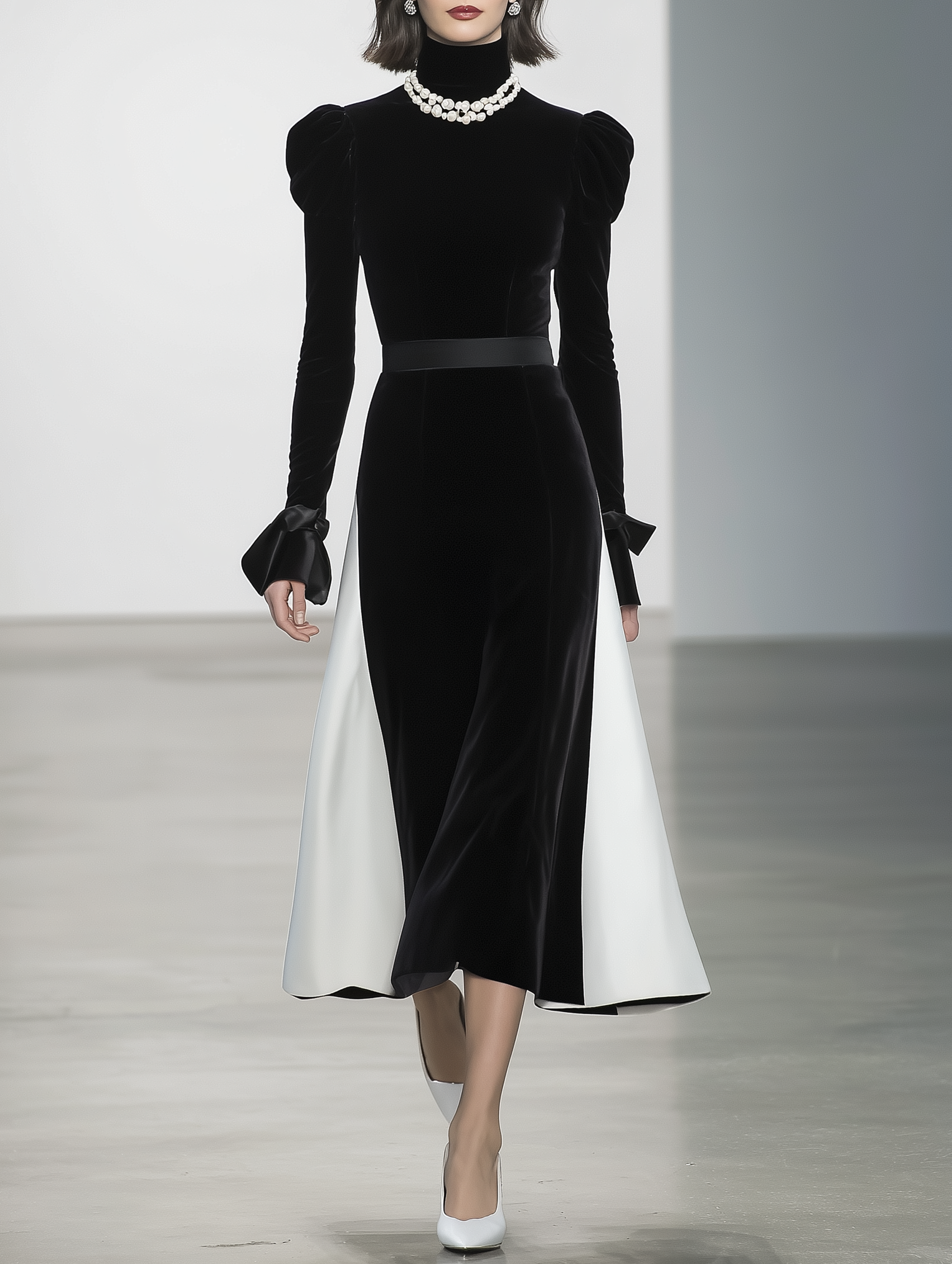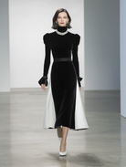 This Women's Black and White Color-blocked Velvet Dress is a stunning blend of elegance and sophistication. With a high-neck design and puff sleeves, this dress offers a modern twist on a classic look. Its fitted waist accentuates the figure beautifully, leading to a graceful midi-length skirt. Perfect for elegant banquets and formal events, this dress exudes a timeless charm.