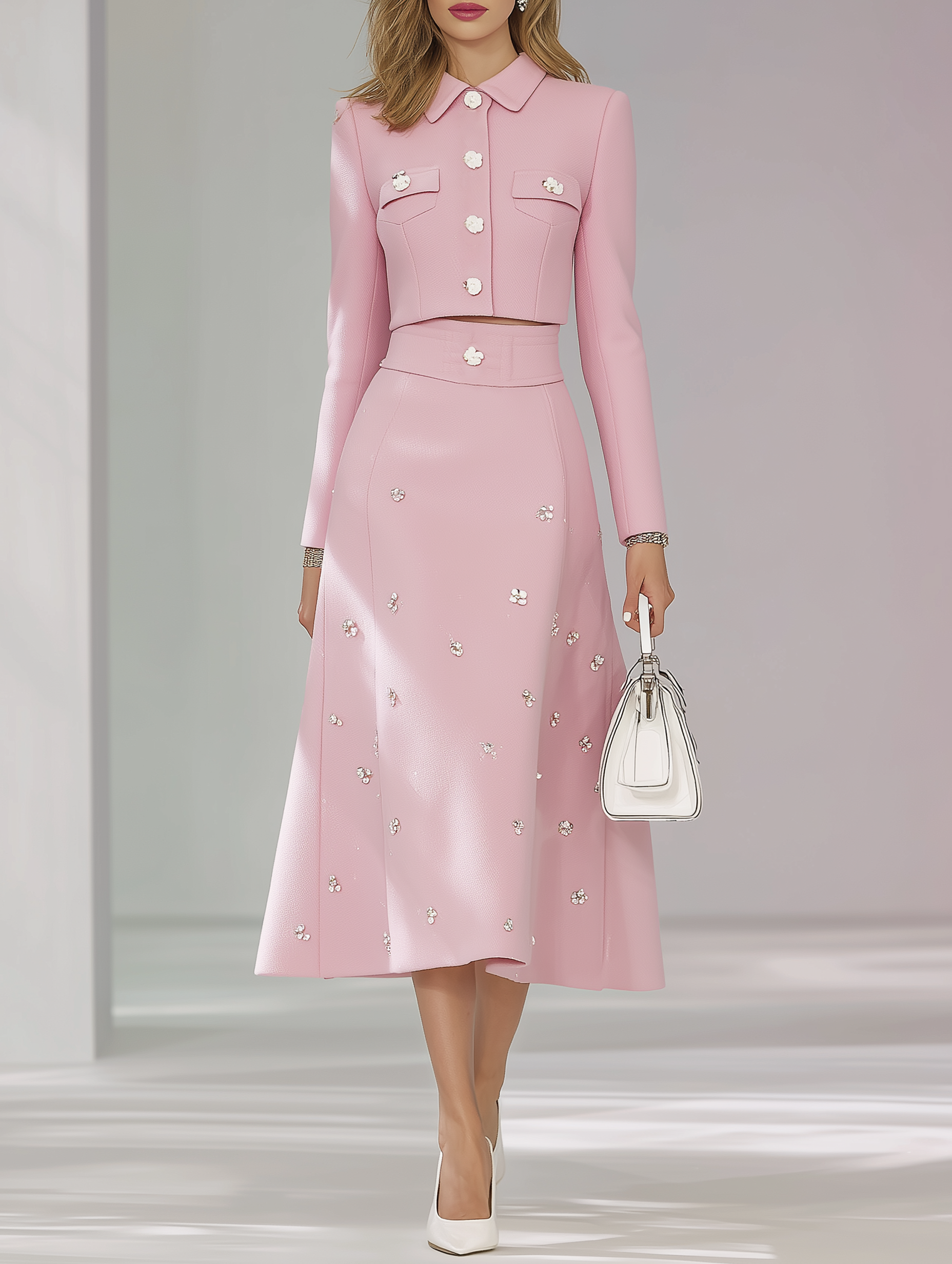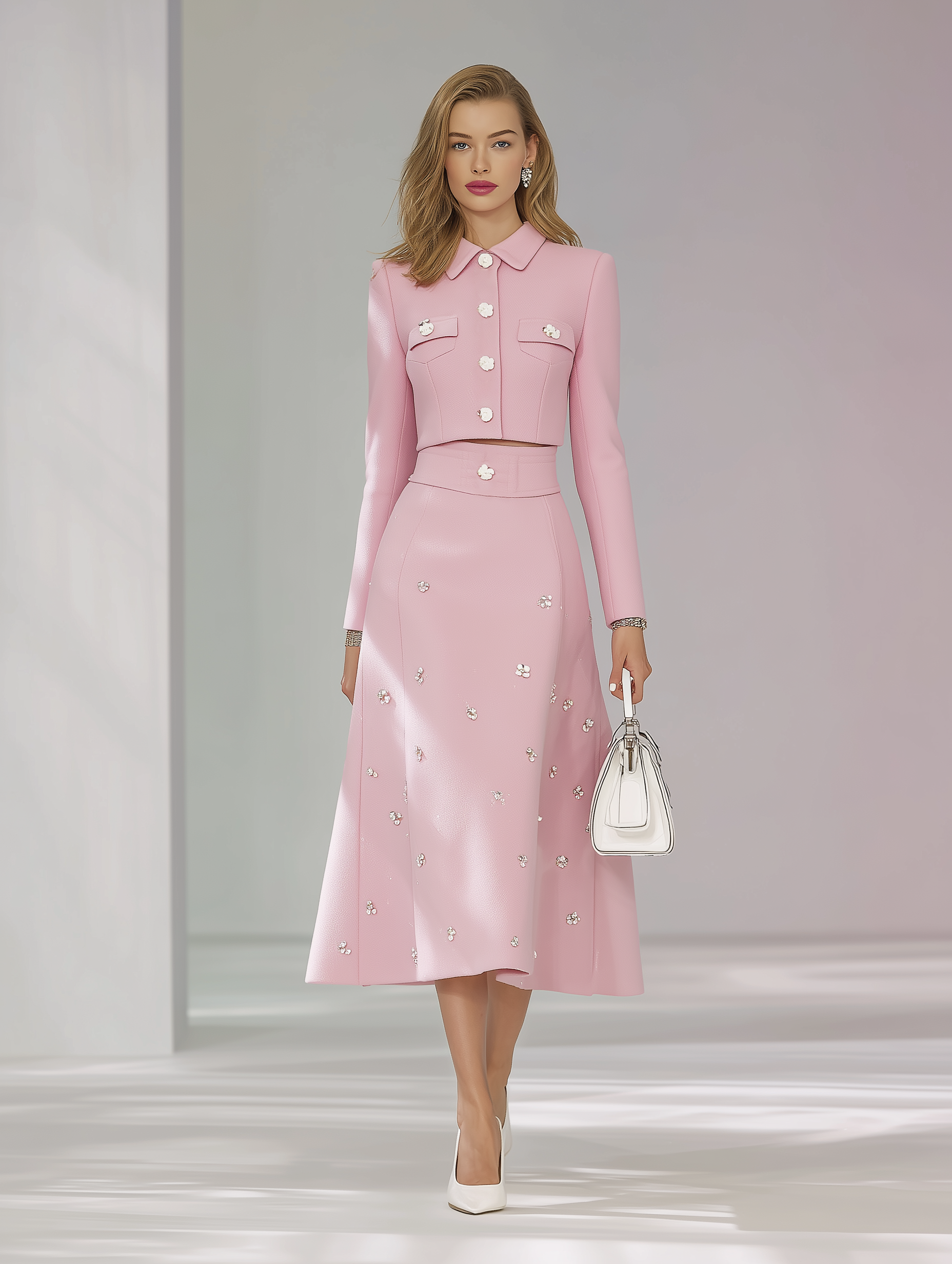 The Women's Pink Diamond-Embellished Two-Piece Set exudes elegance and sophistication. This exquisite ensemble consists of a short collared jacket paired with a beautifully beaded full skirt, making it perfect for both banquets and daily commutes. The unique combination of sumptuous materials and intricate details ensures you stand out in any setting.