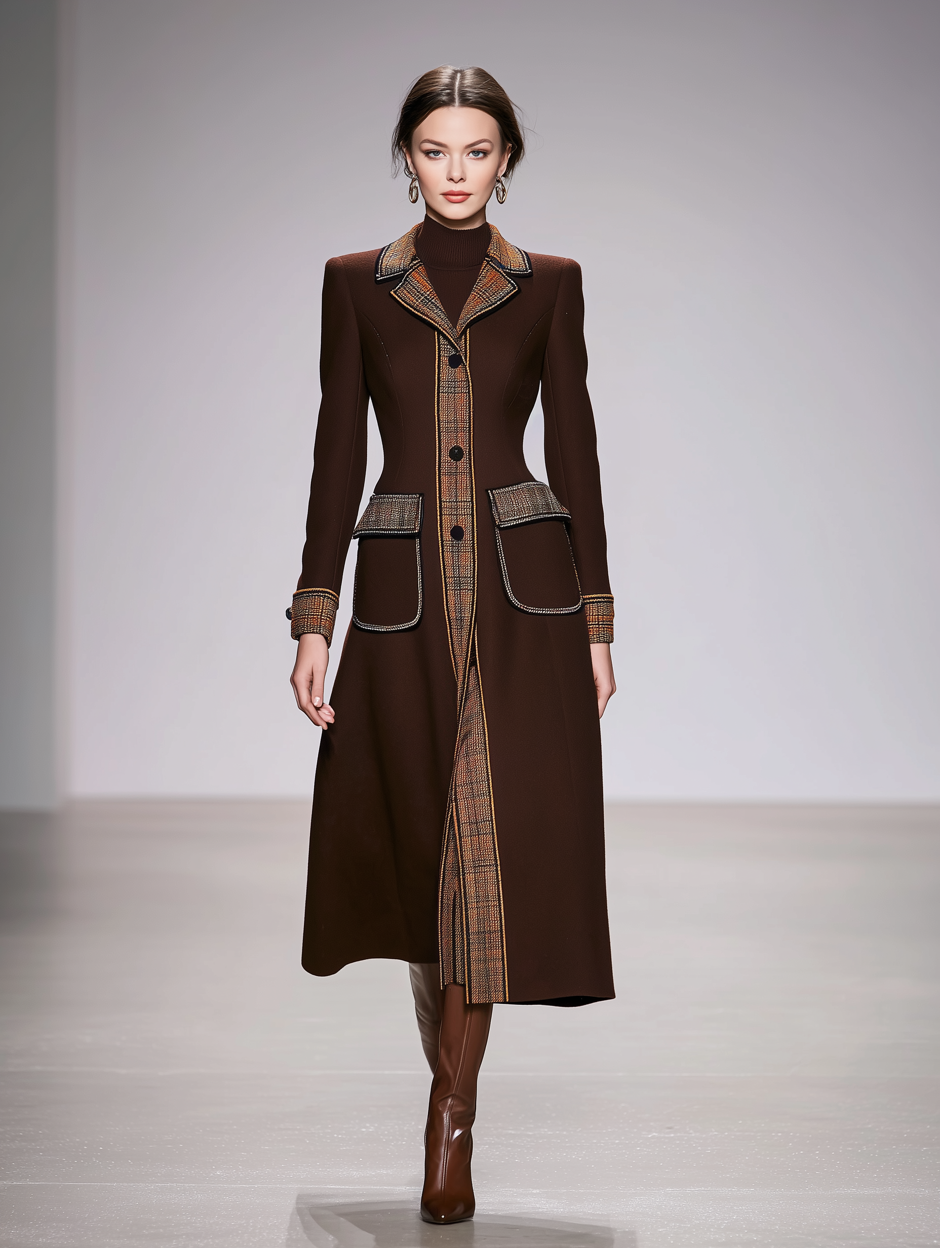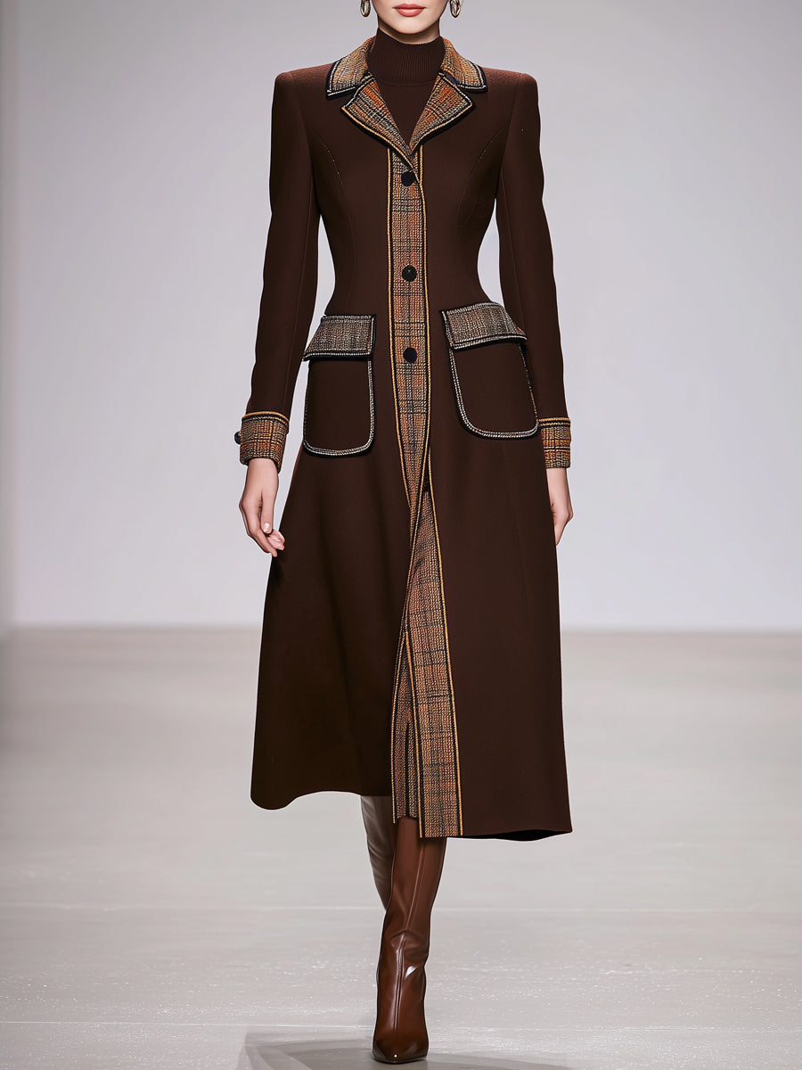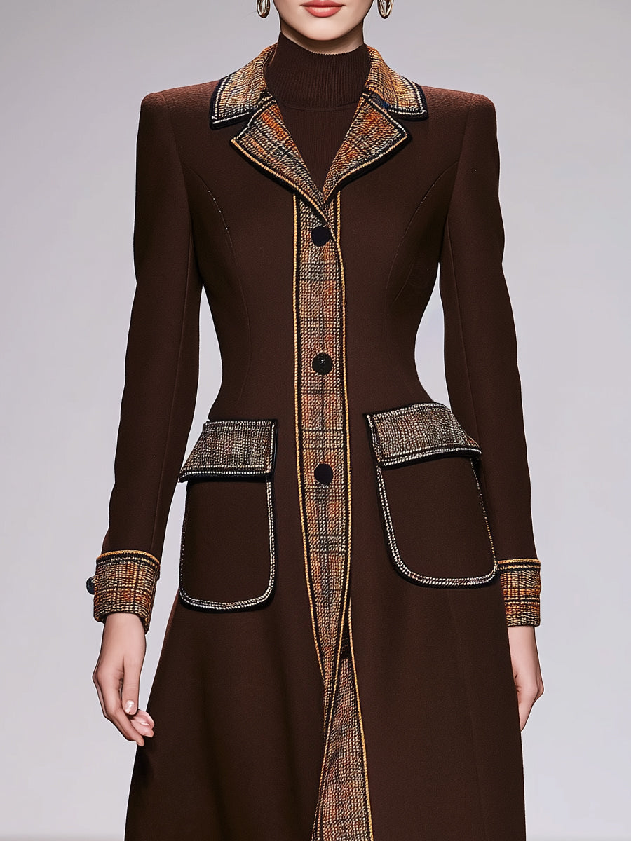Women's Plaid Patchwork Slim-fit Dark Brown Wool Vintage Coat